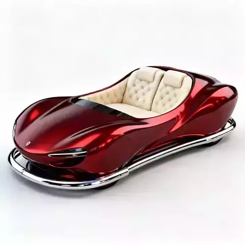 1.Sculpted Deep-Red Bodywork The vehicle's most striking feature is its highly reflective, deep ruby-red paint. The body is sculpted into a single, seamless, flowing form with organic curves and a sleek, aerodynamic profile, suggesting incredible speed and luxury.