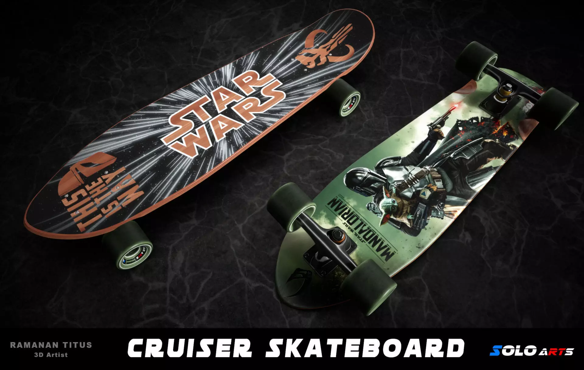 his is a Highly detailed and realistic Cruiser skateboard with Mandalorian Graphics. This model is READY FOR PRODUCTION.