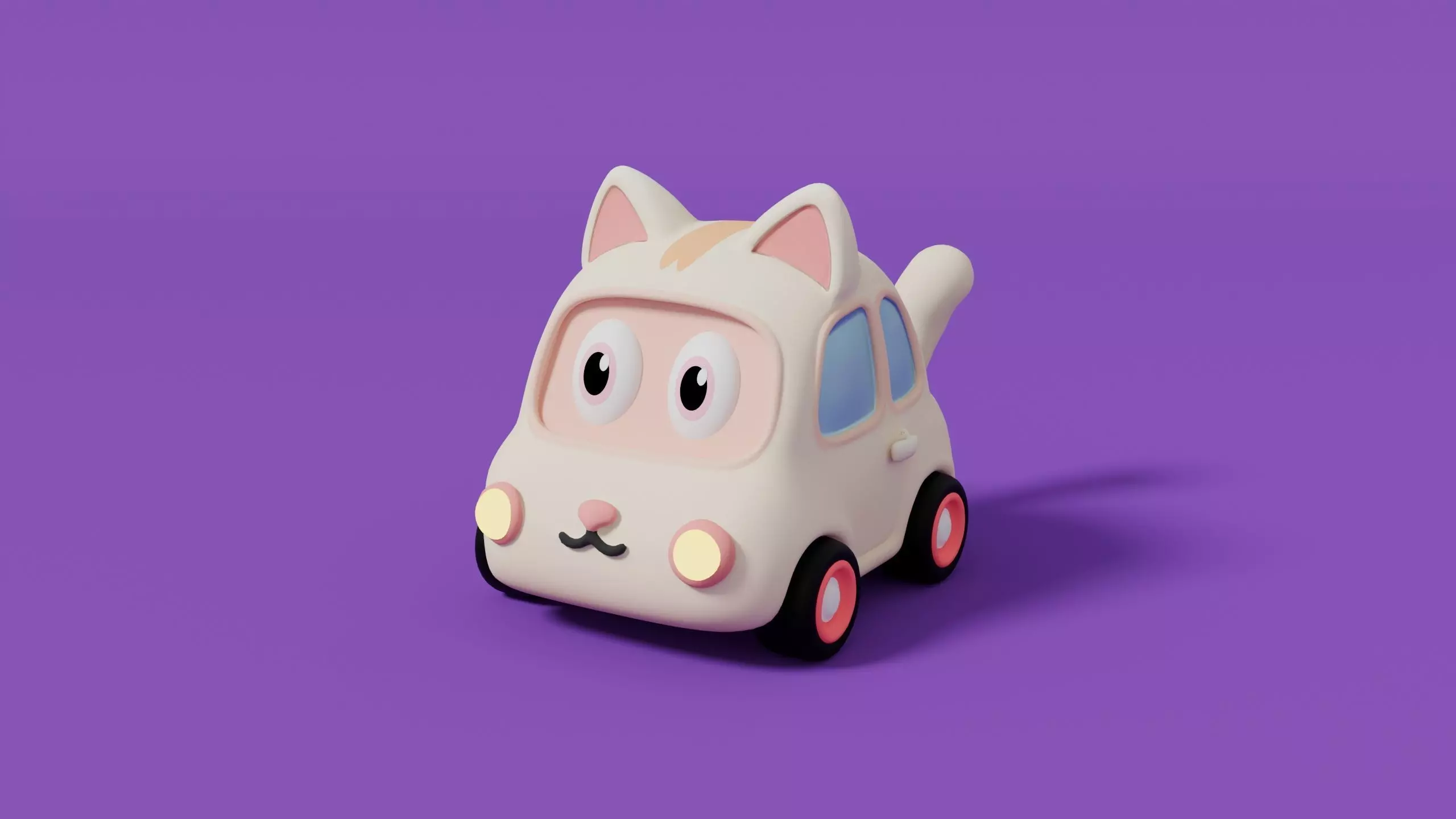 Cute stylized cartoon cat car 3D model designed in a child friendly collectible toy style. The model features a rounded compact car body with integrated cat facial elements including big expressive eyes on the windshield, soft pink nose detail, smiling front bumper expression, and small triangular ears on the roof. The proportions are slightly chubby and balanced to enhance the adorable look.