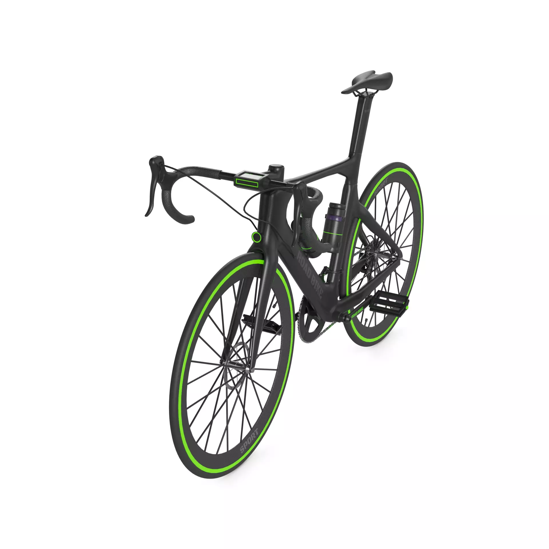 A sleek, futuristic endurance road bike with a matte black carbon fiber frame, neon green accents, and built-in LED lights for enhanced visibility at night.