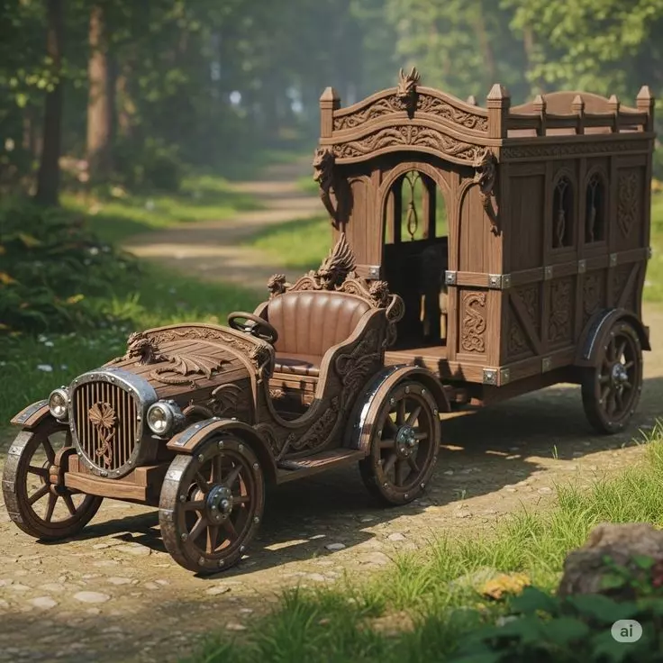 This is not merely a digital rendering; it is a breathtakingly detailed, hyper-realistic 3D asset that captures the very soul of a fantastical, hand-crafted wooden carriage, meticulously designed to evoke a sense of timeless elegance, mythical grandeur, and artisanal mastery, all presented within a serene, sun-drenched forest environment that enhances its storybook quality and makes it an ideal centerpiece for any creative project requiring a touch of magic or historical romance. The vehicle itself is a masterpiece of woodworking, constructed entirely from rich, dark-stained wood that possesses a warm, deep brown hue, suggesting the use of premium, aged hardwoods like walnut or mahogany, which have been polished to a soft, lustrous sheen that catches the ambient light and highlights the incredible depth of the countless carved details. Every surface, from the curved fenders and the rounded front hood to the tall, imposing rear passenger cabin and the spoked wheels, is adorned with an astonishing array of intricate, hand-carved ornamentation. These carvings are not random decorative flourishes but a cohesive, narrative-driven design language, featuring swirling acanthus leaves, delicate floral patterns, geometric fretwork, and, most strikingly, majestic, stylized dragons whose serpentine bodies and fierce, detailed heads emerge from the woodwork, particularly prominent on the front grille, the side panels, and the crown of the roof, lending the carriage an aura of ancient power and fantasy. The front of the carriage boasts a classic, vintage automobile-inspired design, complete with two large, round, chrome-rimmed headlights that gleam with a metallic realism, set into the sculpted wooden bodywork, and a vertical slatted grille at the center, which is also intricately carved with a central emblem, possibly a crest or a symbol of royalty or a noble house. The driver's seat is upholstered in rich, supple brown leather, meticulously stitched with visible seams that add texture and authenticity, and is framed by a high, elaborately carved backrest that flows seamlessly into the main body of the carriage. Behind the driver's compartment, the enclosed passenger cabin rises like a small, mobile palace, featuring arched windows with delicate, carved frames, a heavily decorated roofline crowned with finials and more dragon figures, and sturdy, reinforced wooden paneling on its sides, secured with realistic-looking metal rivets and corner brackets that suggest both strength and decorative intent. The four large, spoked wheels are themselves works of art, with wooden spokes radiating from central hubs, encircled by thick, black rubber tires that show subtle wear and tear, grounding the fantastical object in a semblance of reality. The entire carriage rests upon a rustic, unpaved path made of packed earth and scattered cobblestones, surrounded by vibrant green grass, wildflowers, and the dappled shadows cast by the towering trees of the surrounding forest, creating a picturesque, almost ethereal atmosphere. The lighting is masterfully rendered, simulating the soft, golden glow of late afternoon sunlight filtering through the canopy, casting long, gentle shadows and illuminating dust motes in the air, which adds a profound sense of depth, warmth, and cinematic beauty to the scene. This level of photorealism, combined with the sheer complexity of the model's geometry and texturing, makes this asset invaluable for a vast array of applications, including high-end advertising for luxury brands seeking a unique, story-driven visual, concept art for fantasy films, video games, or animated features, book cover illustrations for historical or magical realism novels, architectural visualization projects depicting enchanted estates or fairy-tale settings, museum exhibits showcasing imagined historical artifacts, or even as a standalone piece of digital art for collectors. It transcends the role of a simple vehicle to become a symbol of opulence, adventure, and the enduring allure of the hand-crafted object, inviting viewers to imagine the tales of its journeys and the distinguished passengers it has carried through enchanted woods and across forgotten realms.