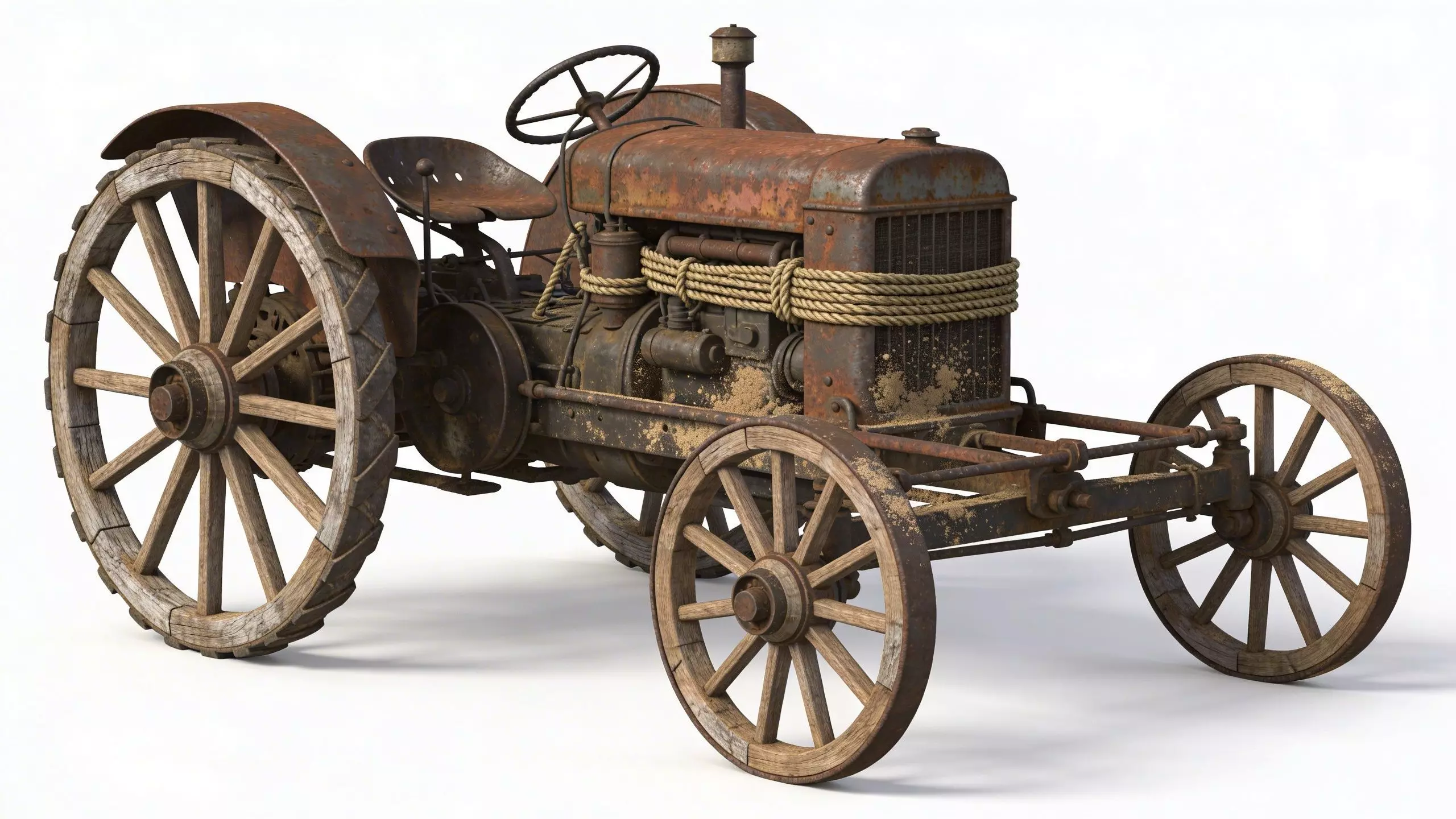 Vintage Industrial Geometry: Classic early 20th-century tractor silhouette modified for a rugged, frontier-themed environment.