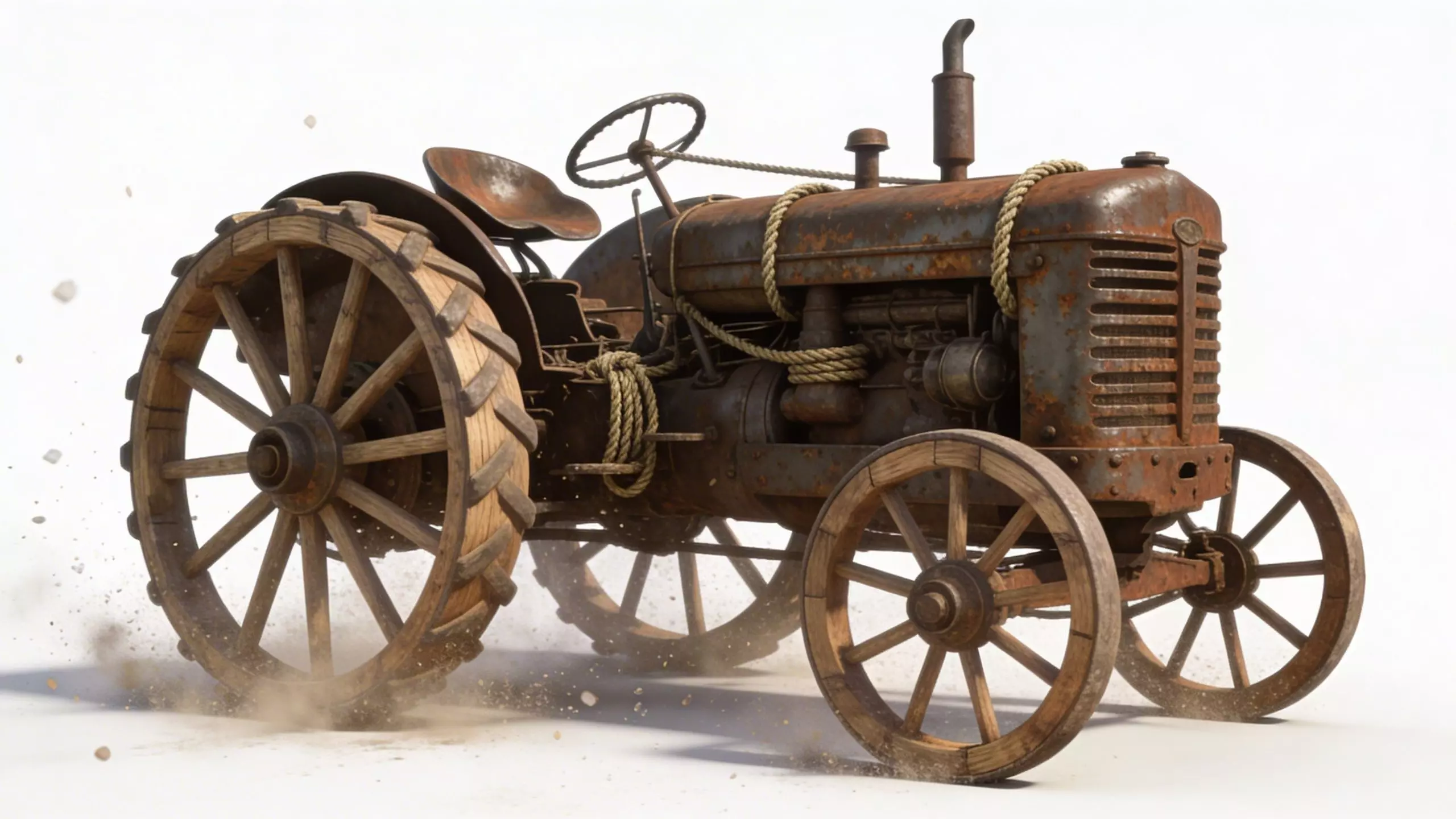 Tractor featuring a heavily weathered and oxidized metal body with a distinct Wild West or post-apocalyptic frontier aesthetic. The vehicle is equipped with a hybrid wheel set, including traditional wooden spoked front wheels and massive, reinforced wooden rear wheels with integrated metal treads for desert navigation. It includes realistic hemp rope wrappings around the engine housing and chassis, a vertical exhaust stack, and a classic open-air pan seat. The entire machine is treated with high-detail textures showcasing deep rust, flaking paint, and accumulated sand, making it an ideal high-detail asset for gritty wasteland environments. This models is suitable for remesh and decimate.