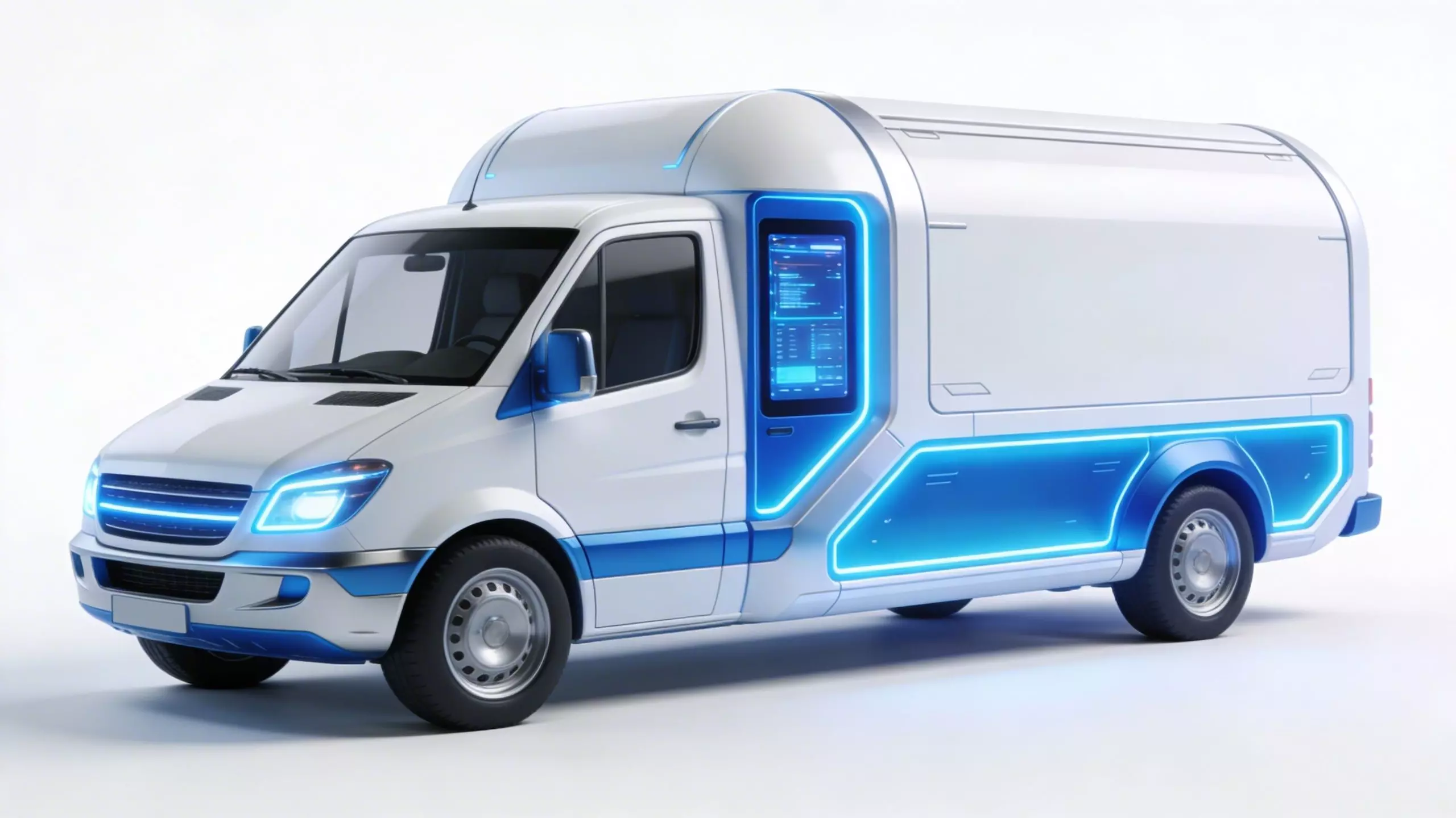 The van in this high-fidelity 3D model features a cutting-edge, aerodynamic design that reimagines modern logistics through a sci-fi lens. The primary body is finished in a clean, professional white gloss, integrated with a large blue-tinted digital interface panel on the side for logistics tracking. The vehicle is accented with vibrant cyan neon light strips along the side panels and front grille, giving it a distinct high-tech appearance. Its streamlined cargo area and reinforced chassis are designed for urban efficiency in a near-future setting. Rendered with advanced PBR materials, the model emphasizes the contrast between the reflective white surfaces, the functional digital display, and the emissive light components. This asset is perfect for futuristic city streetscapes, sci-fi delivery simulations, or as a high-tech utility vehicle in cinematic renders.