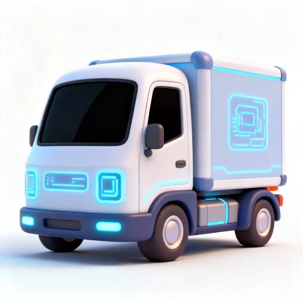 Tagsfuturistic delivery, delivery truck, 3d model, stylized vehicle, pixar style, urban transport, white blue, glowing panel, concept truck, digital asset, high quality, sci fi, autonomous vehicle, cargo van, rounded design, toy style, electric truck, modern logistics, compact vehicle, logistics concept