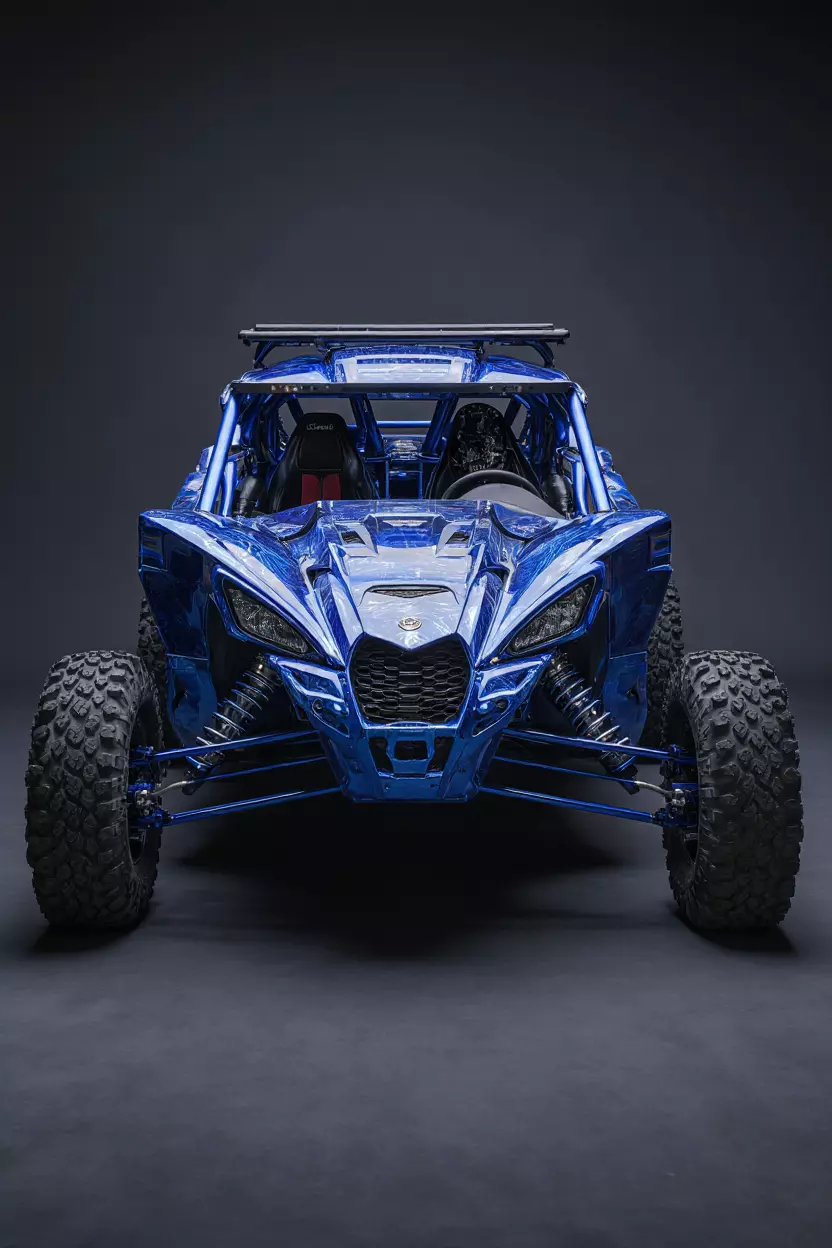 An expertly lit, high-resolution shot captures the front view of a sleek, high-performance off-road UTV (Utility Terrain Vehicle). The vehicle, rendered in a striking, metallic royal blue finish, stands out against a neutral, dark gray studio backdrop. The lighting highlights the vehicle's glossy, contoured body panels and complex suspension components, emphasizing its robust and aggressive design. The large, knobby tires and intricate roll cage system are clearly visible, showcasing its capability for rugged terrain. Every detail, from the powerful LED headlights and detailed grille to the durable suspension arms and shock absorbers, is rendered with exceptional clarity and a professional aesthetic. This image is perfect for showcasing the vehicle's design, engineering, and performance, appealing to enthusiasts of powersports, motorsports, and off-road adventure.
