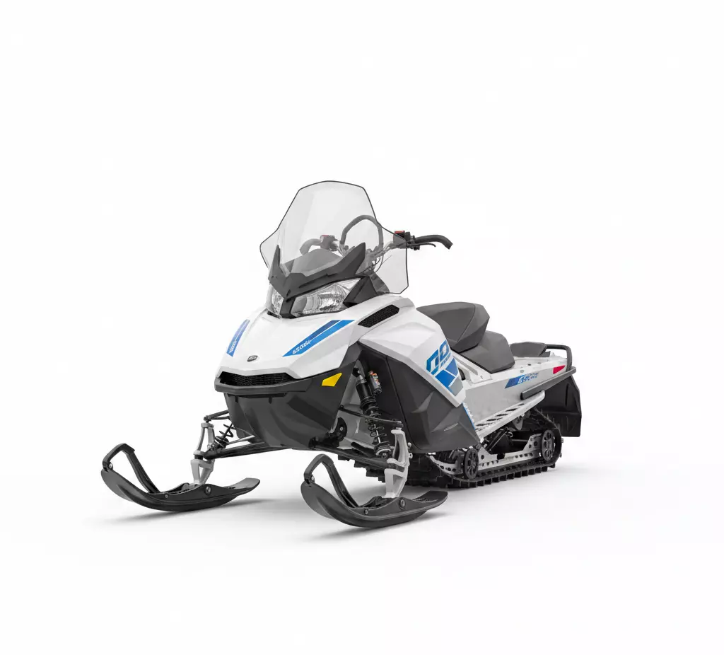 This high-fidelity 3D model expertly captures the sleek and aggressive design of a modern high-performance snowmobile, engineered for speed and precision in winter environments. The model features a striking white and blue aerodynamic body with integrated high-intensity headlights and a clear, impact-resistant windshield. Detailed mechanical components are visible throughout, including the complex front dual-wishbone suspension with high-travel coilover shocks and the heavy-duty rear track system designed for maximum flotation and grip on deep snow. With its textured solo seat, ergonomic handlebars, and realistic venting, this asset is an ideal choice for extreme sports simulations, winter-themed architectural visualizations, or as a premium vehicle prop in modern action games.