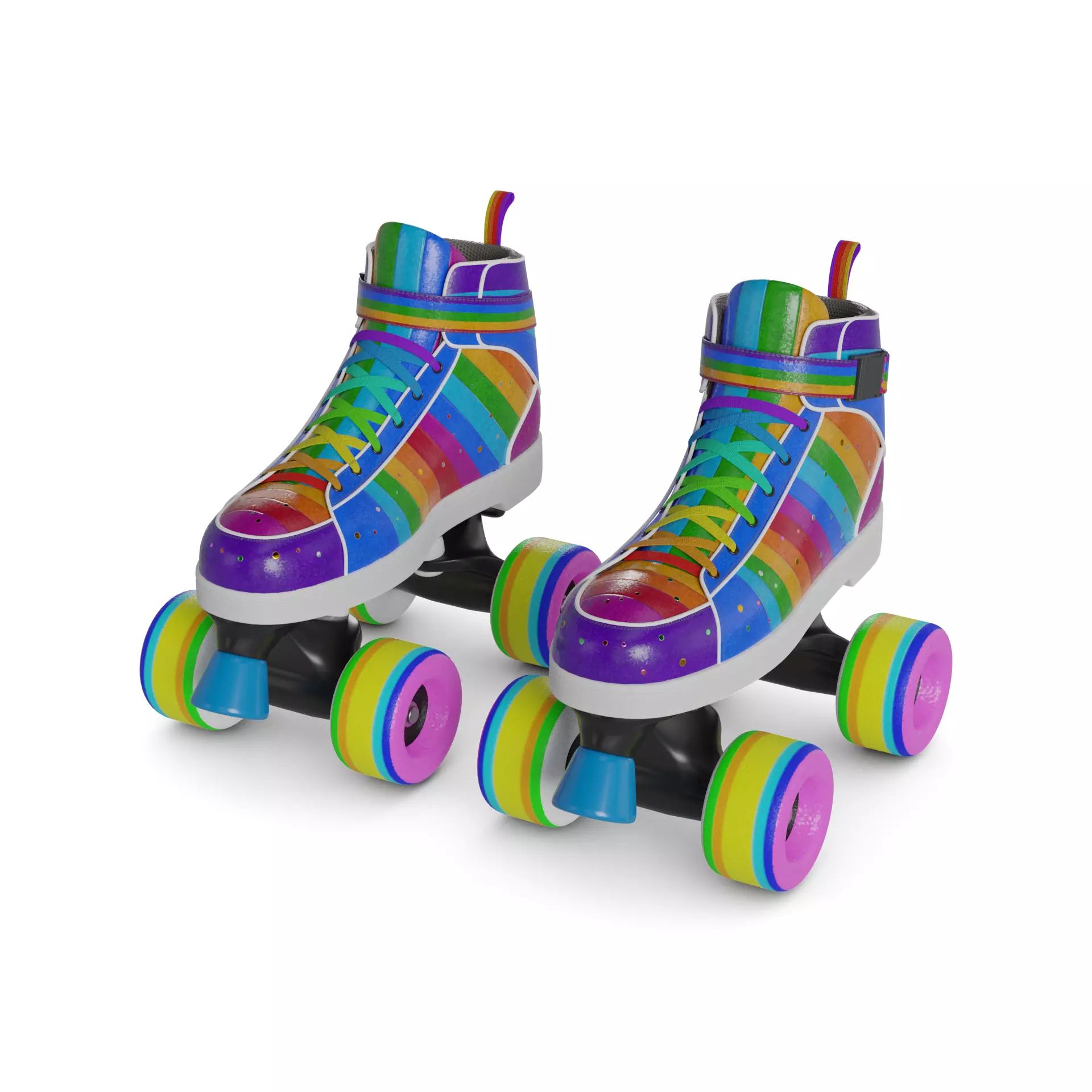 A pair of inline roller skates designed for kids, featuring a vibrant rainbow color scheme with glitter accents, flashing LED wheels, and adjustable straps for a comfortable fit, perfect for young skaters in the current timeline.