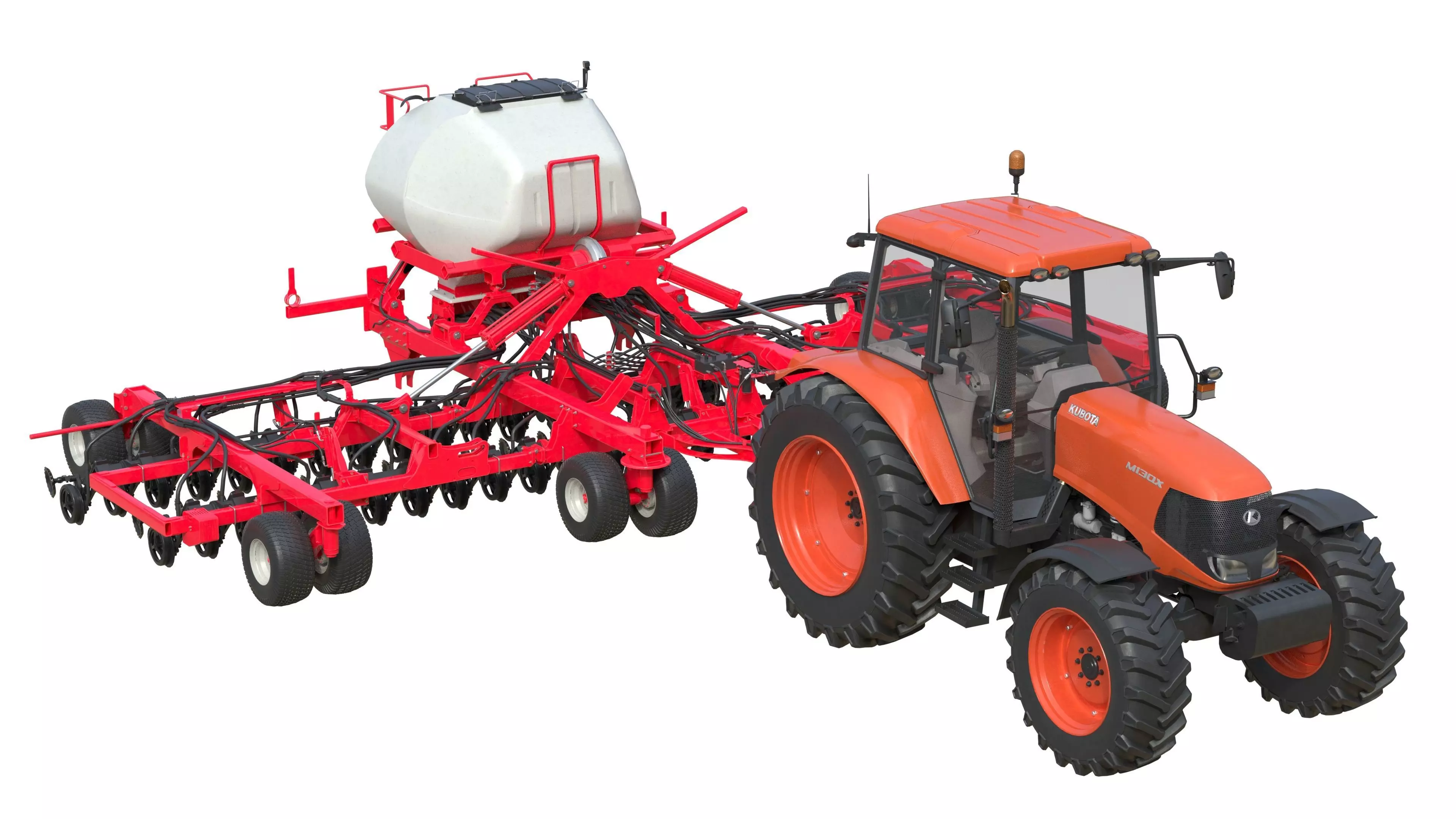 Kubota M130X1 Tractor and Seed Drill Low-poly 3D model