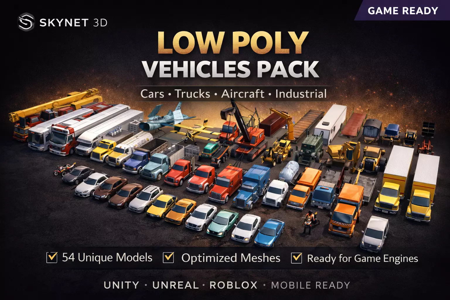 This pack includes a large collection of 54 vehicles including cars trucks planes helicopters construction machines and more perfect for building complete environments and traffic systems