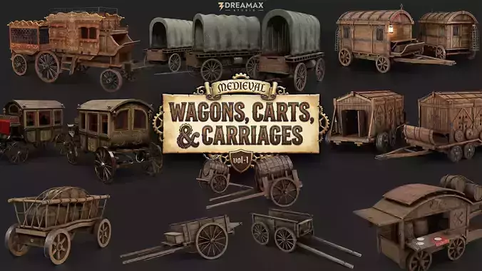 Medieval Wagons, Carts & Carriages collection of historically inspired medieval transportation assets designed for games, cinematics, and environment storytelling.This pack includes a variety of wagons, carts, and carriages commonly used by peasants, merchants, royalty, and military forces. Each asset is built with clean topology, optimized geometry, and realistic PBR textures, making it ideal for real-time applications in Unreal Engine, Unity, and other modern engines.Perfect for medieval villages, trade routes, battlefields, royal processions, caravans, and fantasy worlds, this pack provides essential props to add realism and scale to your environments.
