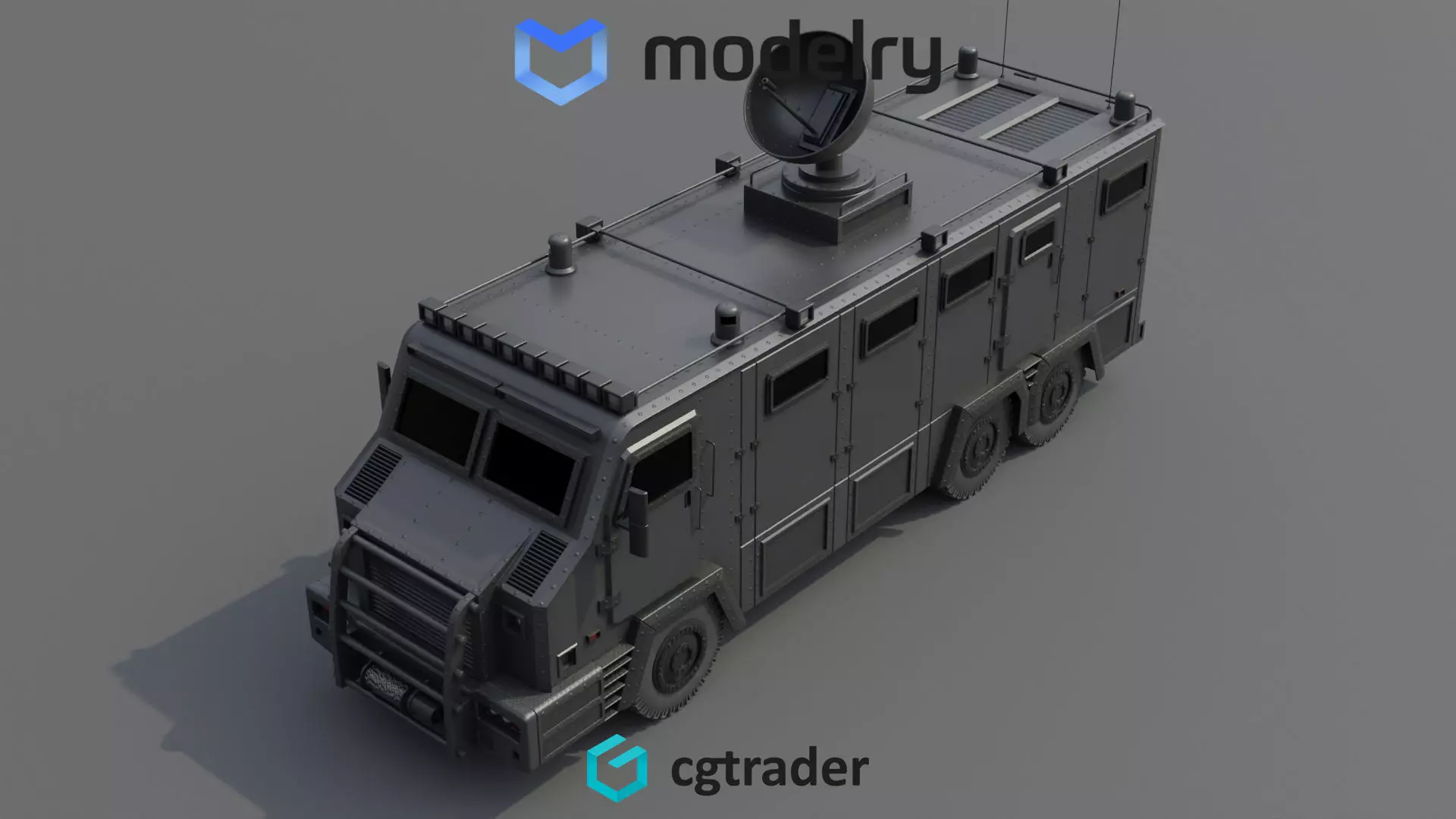 A rugged and durable mobile command center in matte black, featuring bulletproof windows and a satellite dish on the roof, ideal for coordinating operations and providing a central hub in crisis scenarios in the current timeline.