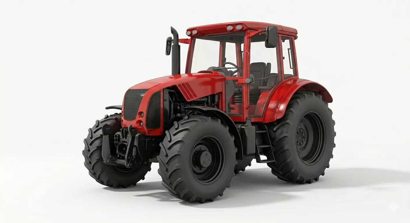This 3D model depicts a modern agricultural tractor, showcased in a vibrant red finish with a focus on functional design and mechanical detail. The rendering highlights a fully enclosed glass operator cabin, providing 360-degree visibility, and is topped with an integrated lighting array for nighttime operations. The vehicle's powerful stance is anchored by large, high-traction pneumatic tires with deep treads, designed for heavy-duty field work and stability across varied terrain. Technical features such as the front-mounted hitch assembly, vertical exhaust stack, and streamlined hood cooling vents are meticulously represented, emphasizing the model's industrial utility. Presented against a minimalist white background, the model exhibits clean topology and realistic material shaders, making it a versatile asset for farming simulations, industrial visualizations, or educational content.