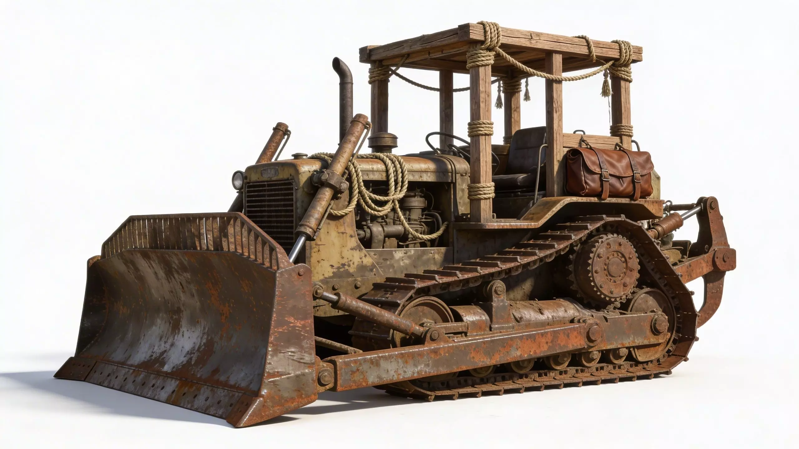 Bulldozer featuring a heavily rusted and weathered industrial design with a unique post-apocalyptic or Wild West aesthetic. The machine is equipped with a massive, sand-caked metal blade and a wooden cabin frame with tattered, leaf-like roof detailing. It includes realistic rope wrappings around the hydraulic cylinders, a side-mounted leather gear bag, and a wooden cargo box. The bulldozer sits on heavy-duty, rusted metal tracks partially buried in sand, supported by an intricate system of rollers and sprockets. This models is suitable for remesh and decimate.