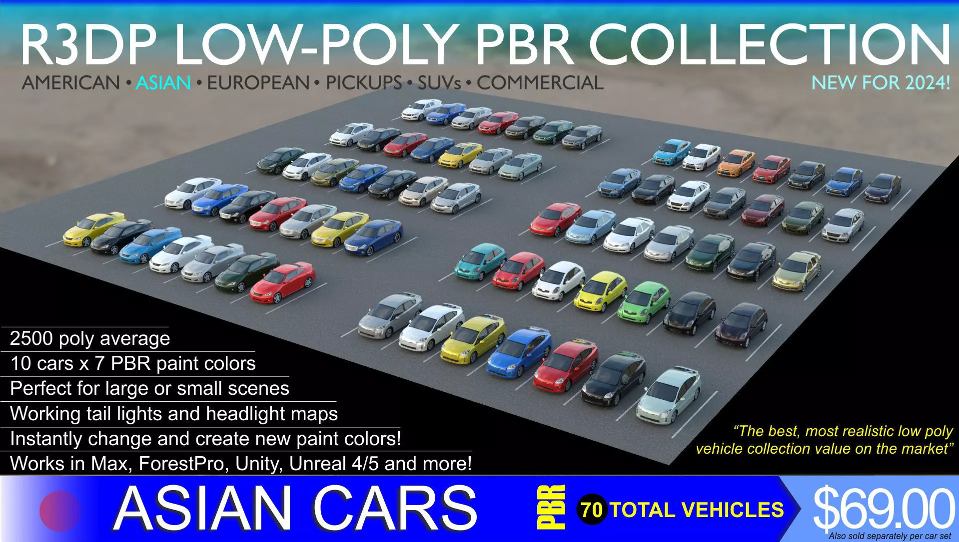 Professionally modeled and efficent low-poly (2500 per car average) PBR vehicles for large scenes or small! 10 car models with 7 paint colors already set up and applied in the Max scene and exports DWG, OBJ and FBX files.Headlights and tail lights are emissive mapped and included. All paint colors can be changed instantly as the vehicle bodies are a solid color, not a mapped color. These vehicles look great close or far away. If you have been looking to add the next step of reality to your scenes or games without losing preformance, these vehicles are for you. We also sell each of the vehicles (7 per vehicle model set) as seen here for only $10 if you don't need the entire parking lot. Works in Max or any modeling program, including UNITY and UNREAL 4/5. These vehicles have been completely upgraded to the latest PBR standards and are an incredible value at only $69.00
