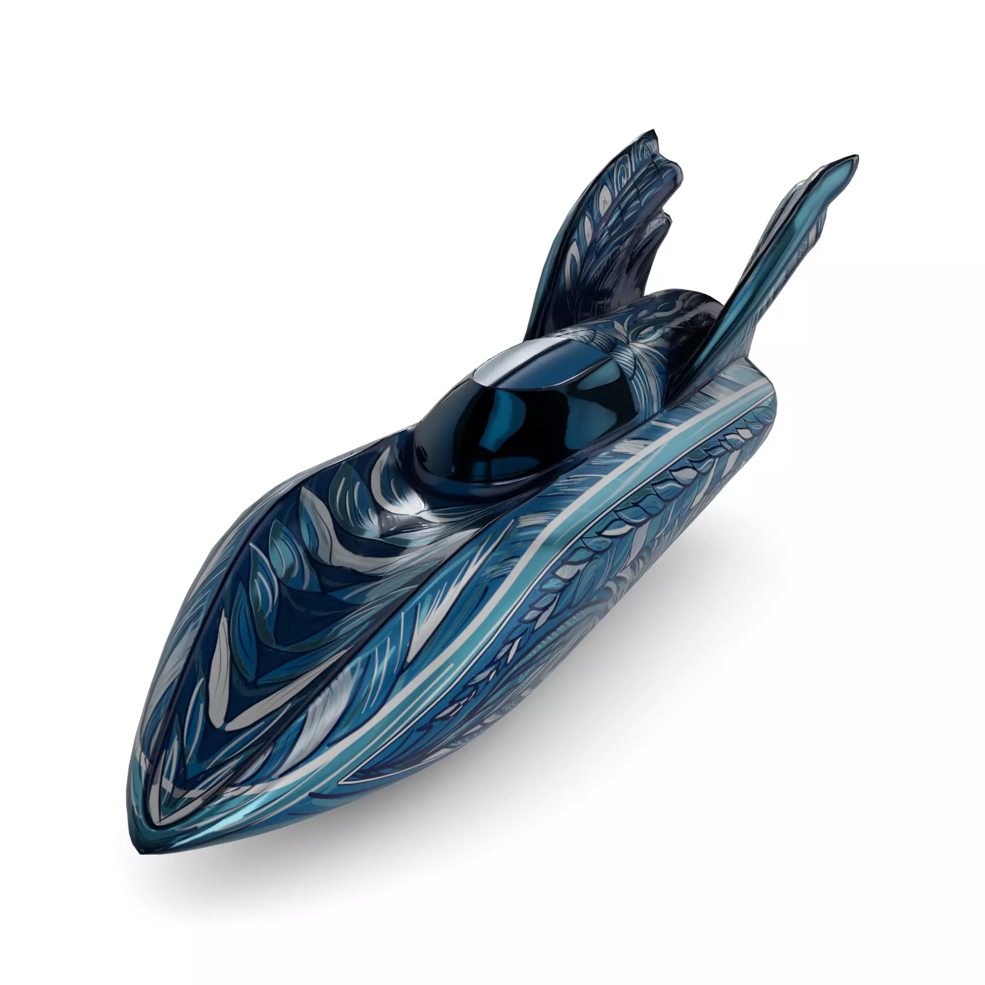 A bold and eye-catching racing iceboat with a metallic blue finish, boasting a unique angular design with intricate patterns etched into the surface, built for both style and speed on icy surfaces, sure to stand out in thrilling races on frozen lakes in the current timeline.