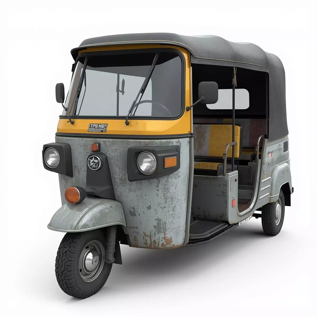 A high-quality 3D model of a three-wheel tuk tuk vehicle, designed for professional use in urban simulations, games, and architectural visualization. This model features a detailed worn aesthetic with realistic weathering and rust on the metal body, capturing an authentic urban look. Please note that this model is not rigged. It is ready for seamless integration into your preferred rendering engine or 3D software.
