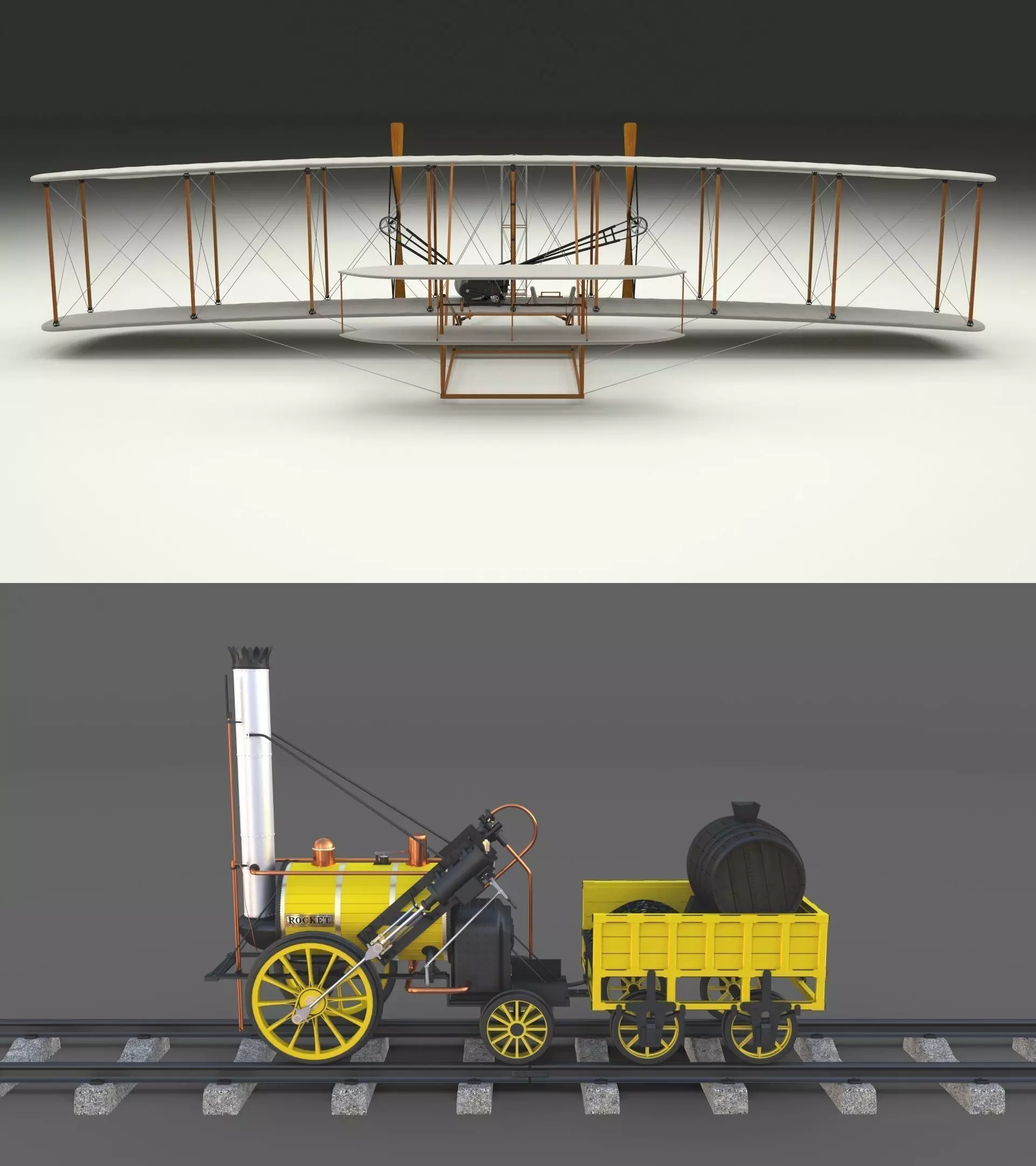 3D model pack consisting of the first succesful airplane, The Wright Flyer and the very first succesful locomotive, The Rocket