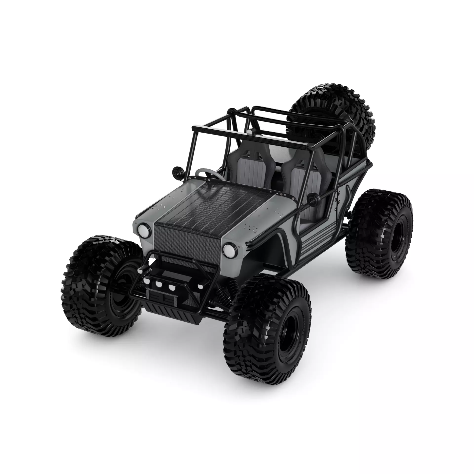 A rugged off-road vehicle from the historical timeline, this side-by-side car features a sleek, metallic silver body with black accents and a matte finish, equipped with large, knobby tires for traversing rough terrain, a roll cage for safety, and a spacious interior with comfortable seating for two passengers.