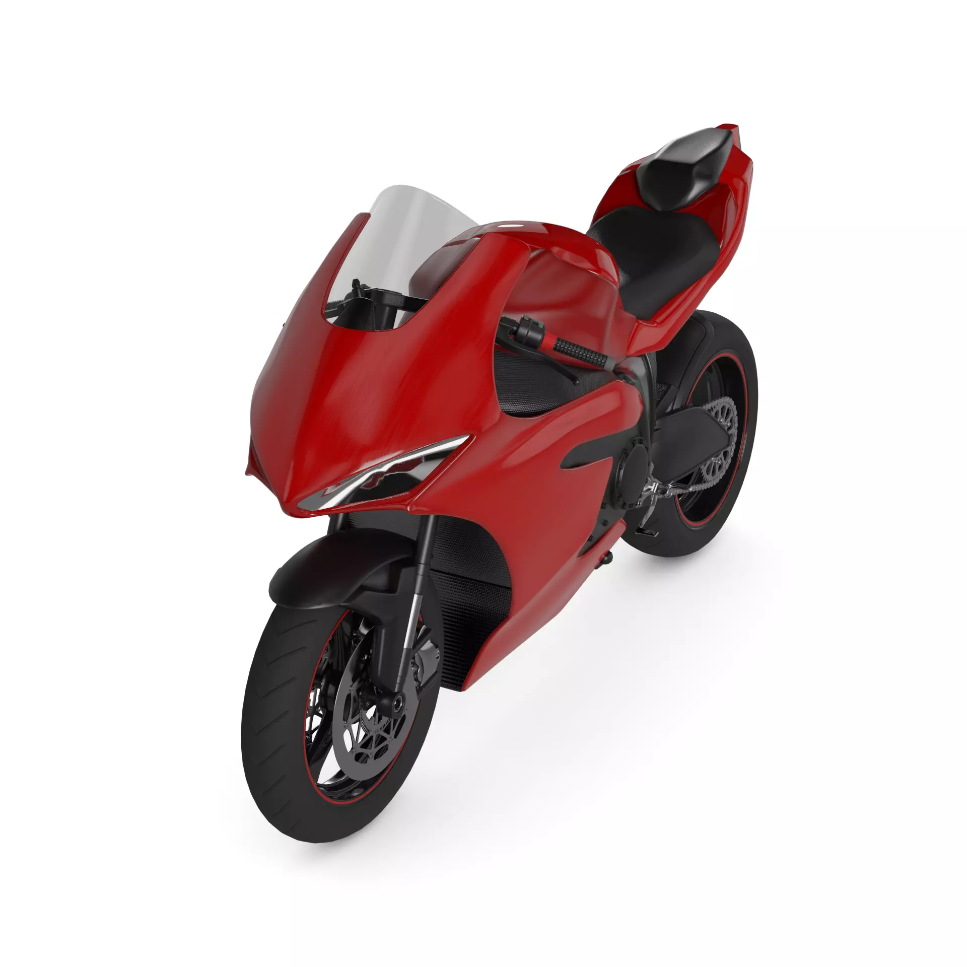 A sleek and modern sport bike with a vibrant red color, featuring a curved frame and aerodynamic design, perfect for zooming through city streets in the current timeline.