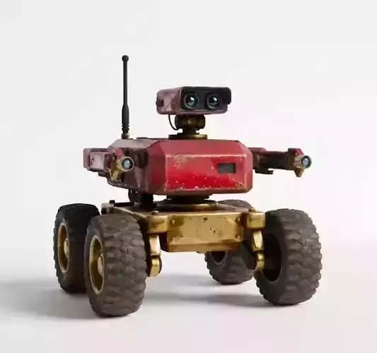 Tags Robot Rover Sci-Fi Red Crimson Gold Brass Rust UGV Drone Vehicle 3DModel GameAsset Weathered Muddy Antenna
