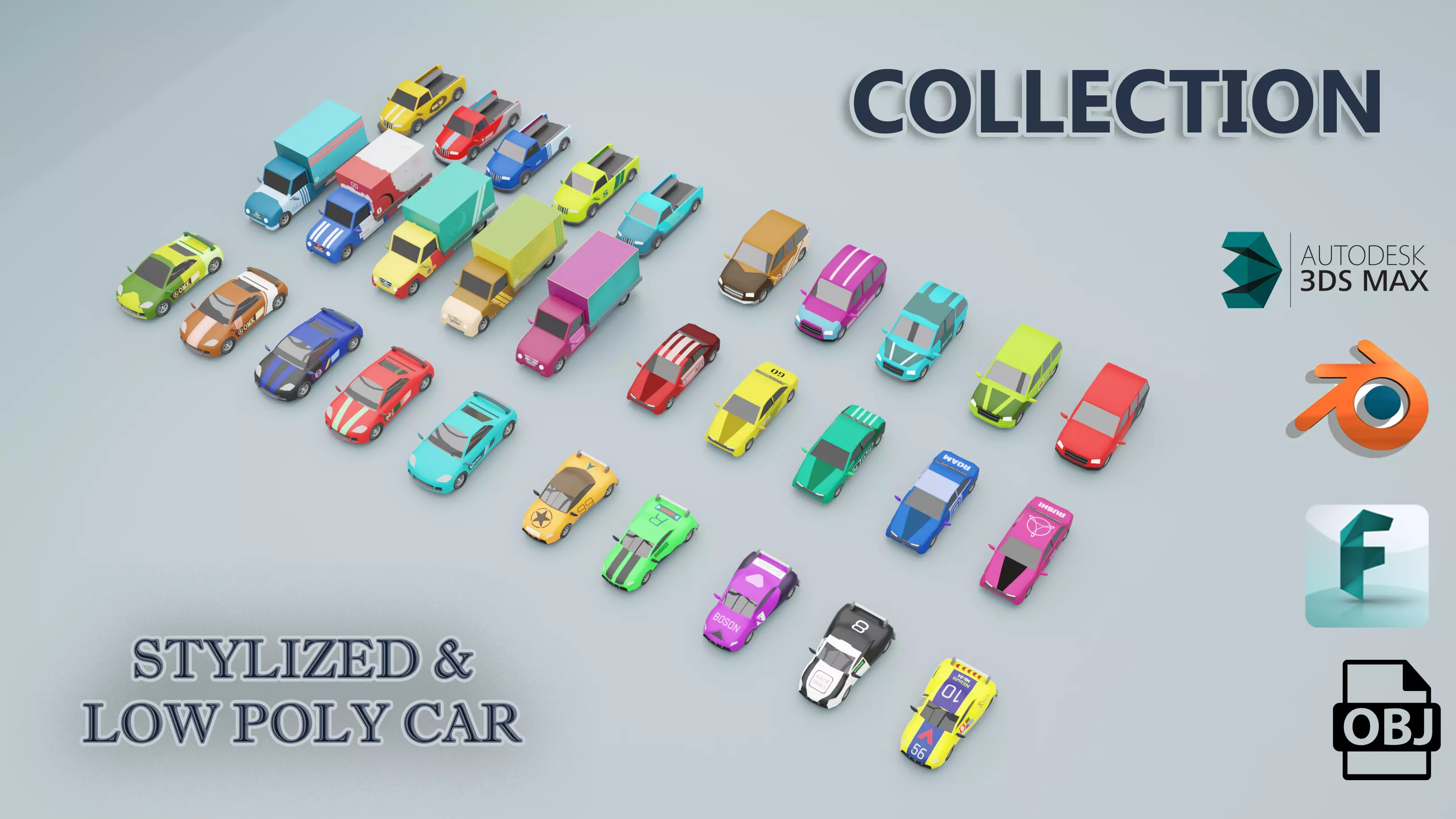 3d stylized low-polygon car collection- definitely The collection have 6 type of differentcars and each car has 5 type of stylized asthetic textures and the images arewas rendered in cycle engine.The models are ready for game (game-ready) , various scenes and rendering.