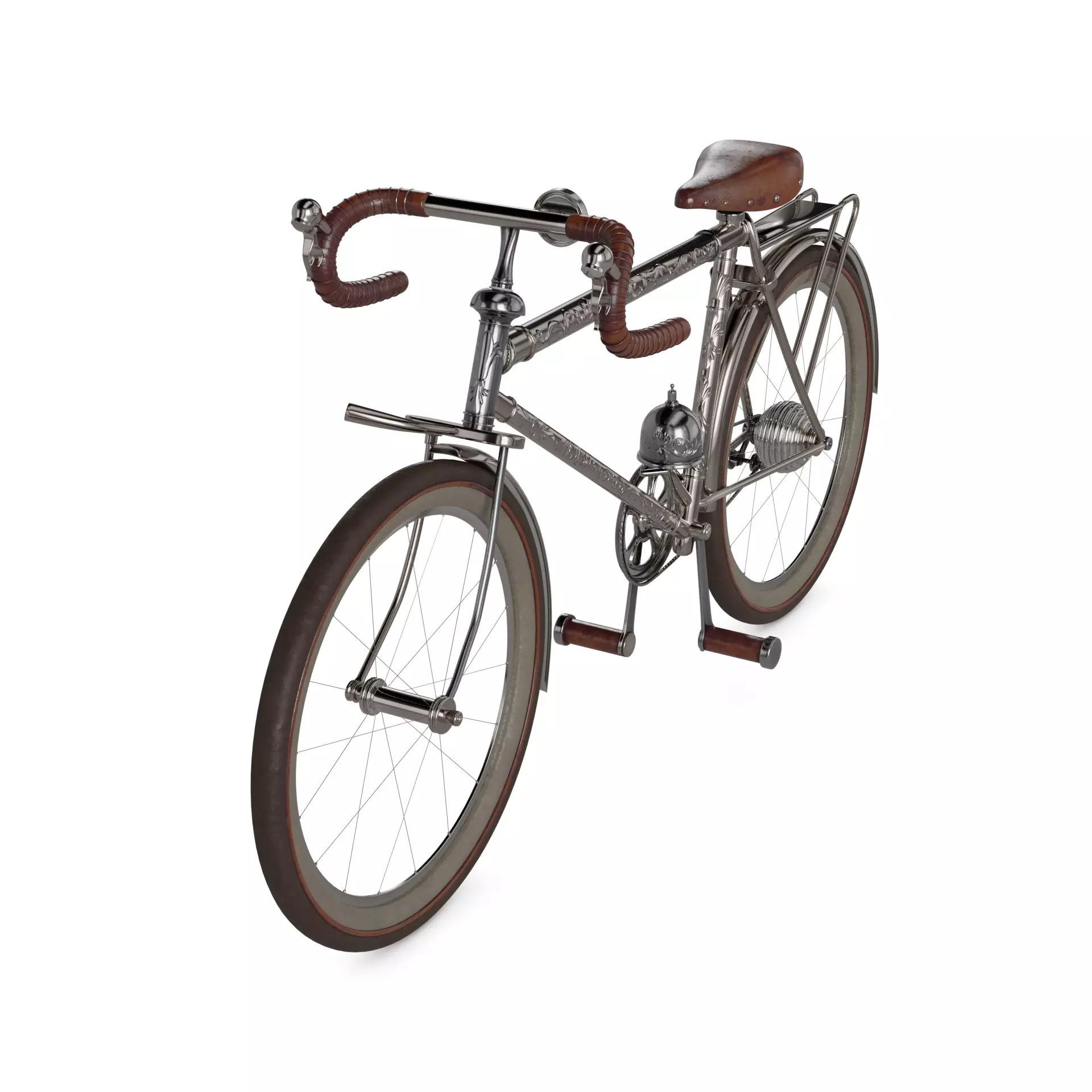 A traditional road bike from the historical timeline, featuring a sleek silver metallic frame with intricate floral engravings, complemented by leather handlebars and a vintage bell attached. The wheels are large and spoked, with white rubber tires for a smooth ride.