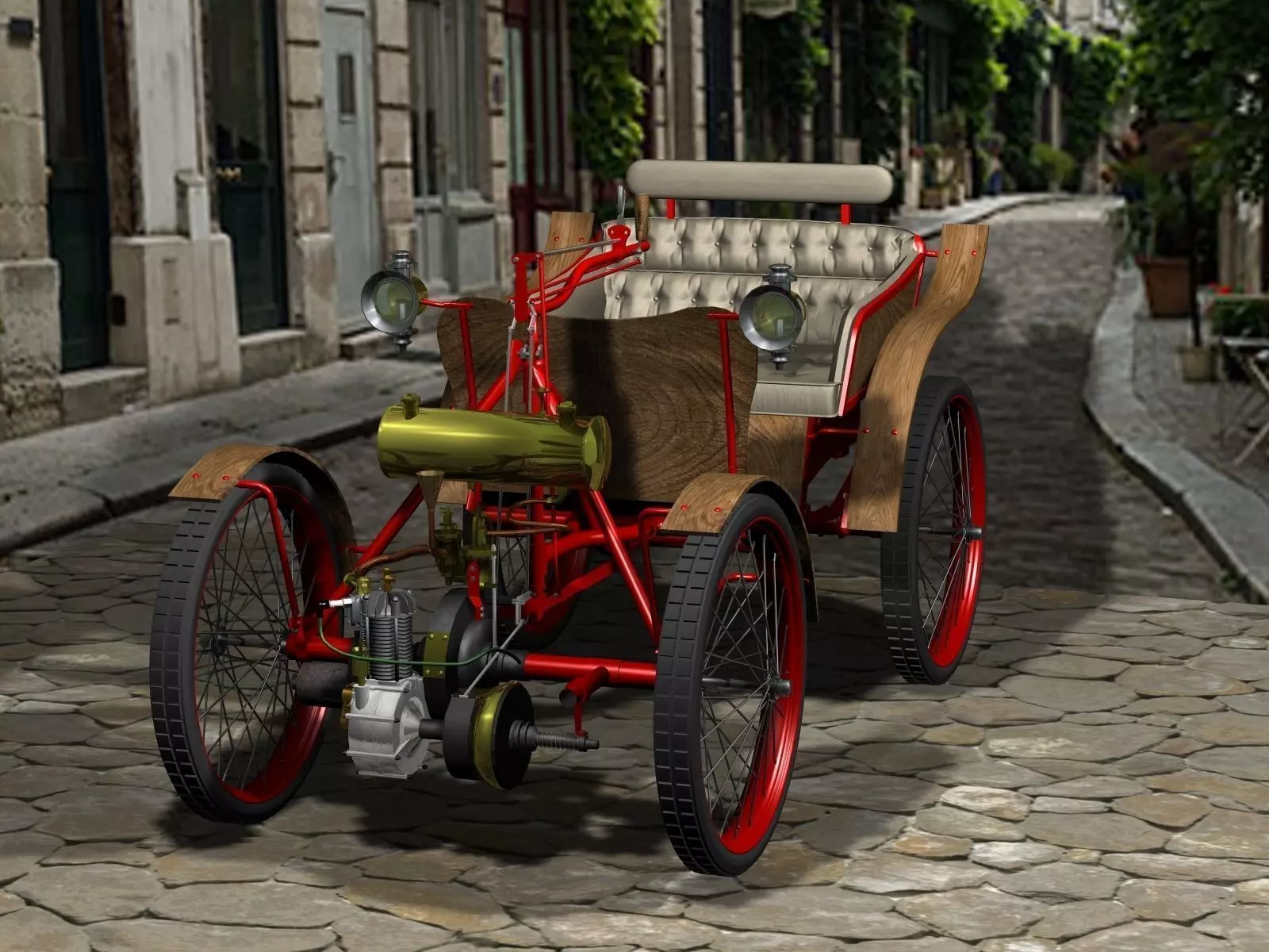 motor tricycle placed in front of the trailer and tiller-steered. It must have been one of the first motorised articulated vehicles and may well have been the first front-wheel driven car. This car was powered by a 2.1kW De Dion-Bouton air-cooled engine, but several different engines were soon fitted.