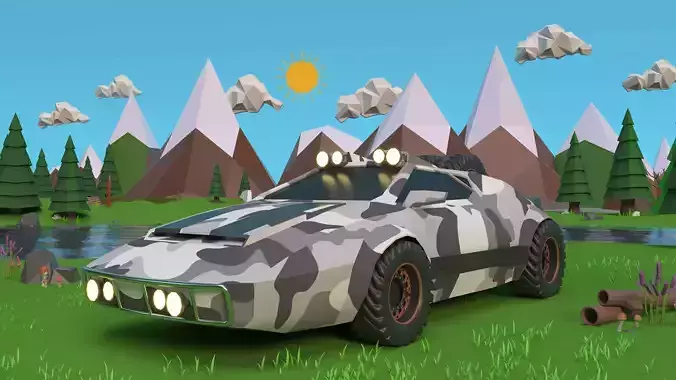 Low - poly model of a off road car.The off - road car model is inspired by a mix of the Lamborghini Countach and Lancia Stratos vehicle models which bring about a sports car appearance.