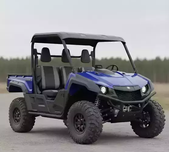 The vehicle is captured from a slightly low, front three-quarter angle, emphasizing its sturdy construction and readiness for various terrains. Its vibrant blue body panels are contrasted effectively by the black roof, roll cage, and undercarriage components, giving it a practical yet stylish appearance. The prominent front grille and powerful round headlights suggest capability and visibility.