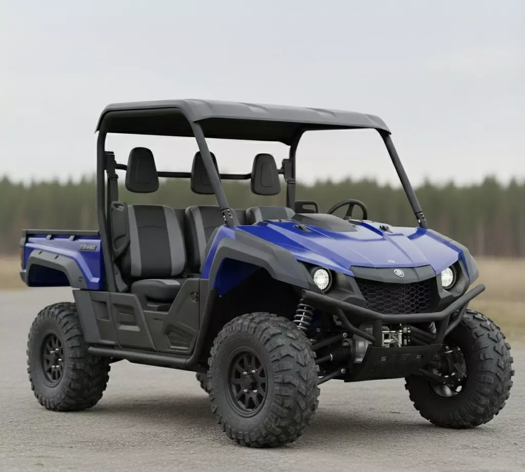 Equipped with aggressive, knobby tires and a visible suspension system, the Rhino appears well-prepared for off-road adventures and demanding work tasks. The spacious two-row seating configuration, with distinct grey and black upholstered seats, indicates its capacity to comfortably transport multiple passengers. A small utility bed is visible at the rear, hinting at its cargo-carrying capabilities. The minimalist natural setting allows the vehicle to stand out, highlighting its design without distraction. The overall impression is one of durability, reliable performance, and a perfect companion for outdoor utility or recreational activities.
