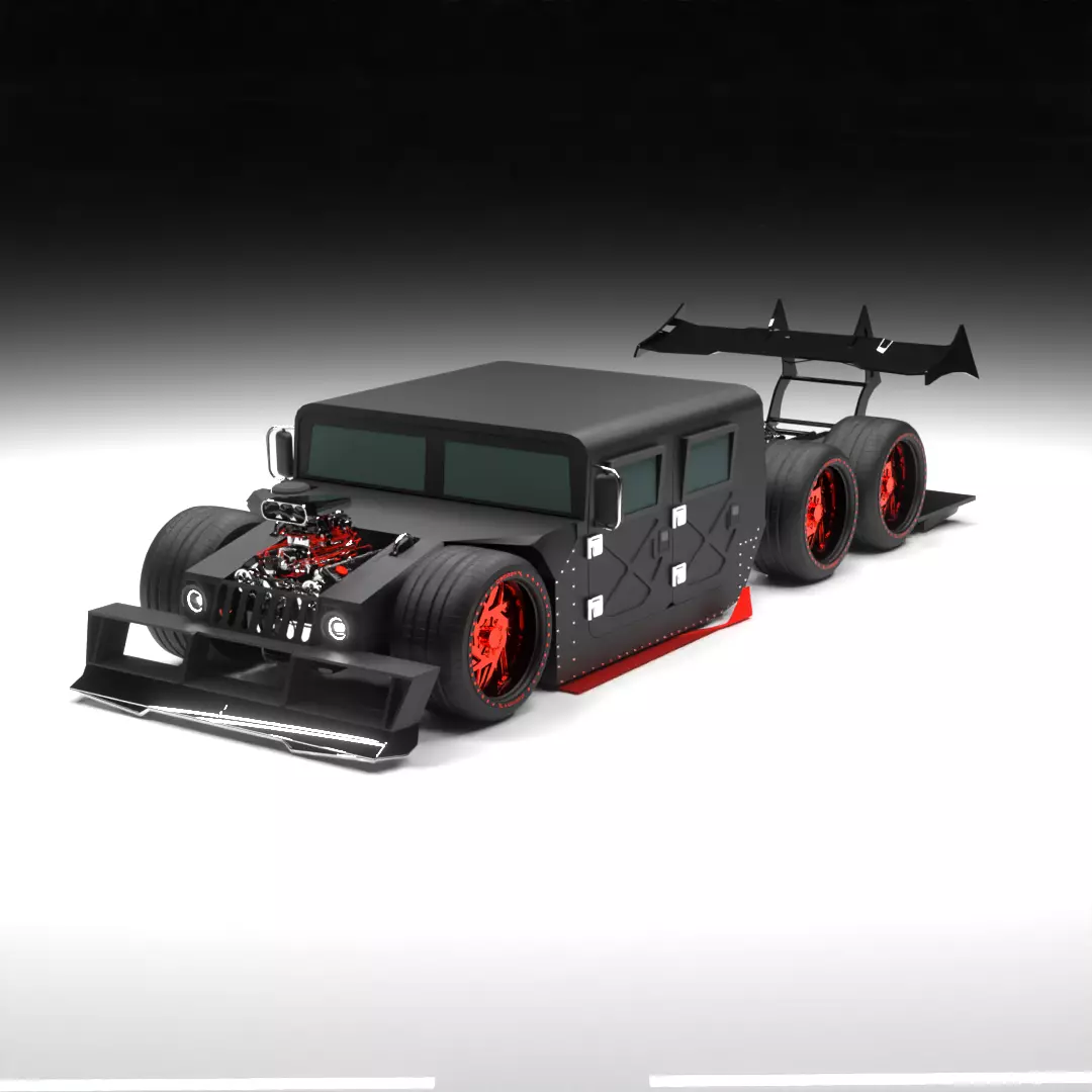 Design & Features:Body: The vehicle retains the armored, boxy structure of a Hummer but is transformed into a low-slung speed beast with a matte black finish and riveted panels for an industrial look.Front End: A massive splitter and wide-body fenders give it a race-inspired aesthetic, while the exposed supercharged V8 engine with chrome and red accents hints at extreme horsepower.Wheels: Ultra-wide custom deep-dish red rims wrapped in low-profile racing slicks ensure maximum traction.Rear Section: The addition of six wheels (tri-axle) combined with an oversized twin-tier wing provides high-speed stability and downforce.Side Profile: Heavy-duty latches and rivets on the doors enhance the armored appearance, while custom side skirts and ground effects improve aerodynamics.Purpose & Performance:This machine is built for extreme speed and grip, merging the brutality of an off-roader with the precision of a race car. Perfect for drag racing, high-speed track runs, or just dominating the streets with its menacing presence.
