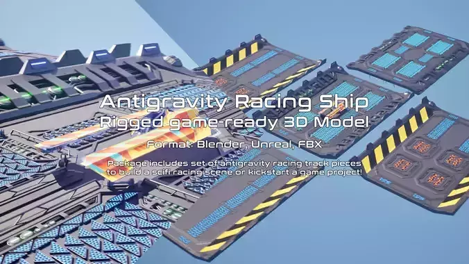 Package includes set of antigravity racing track pieces in Blender and Unreal formats, to build a scifi racing scene or kickstart a game project!