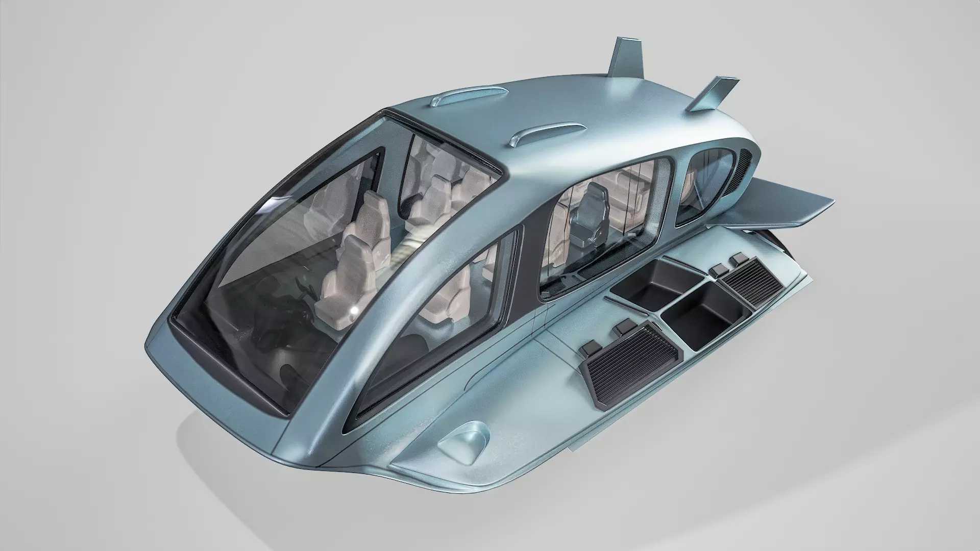 AI-generated car concept realized in 3d. 4k textures are included. The mirror has separate material.A futuristic mobile houseboat designed for the modern explorer, featuring a sleek and aerodynamic shape reminiscent of a spaceship. The exterior is a metallic silver color, with LED lights lining the edges for a futuristic touch. The interior is equipped with state-of-the-art technology, including a virtual reality entertainment system for immersive experiences on the water.