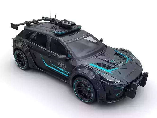 Futuristic Armored Police/Enforcement SUV 3D ModelDescriptionThis 3D model presents a heavily modified, Futuristic Armored SUV designed for urban policing, high-speed interception, and tactical enforcement in a high-tech or dystopian city. It combines the aggressive stance of a modern performance SUV with extensive armoring and specialized tactical gear.