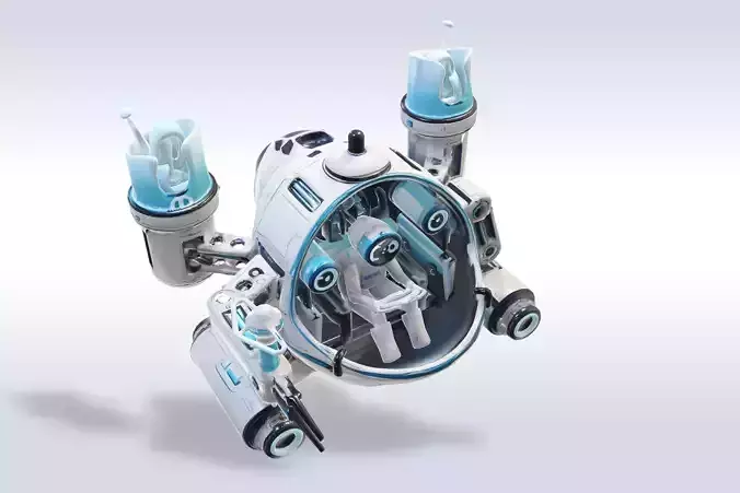 This is a high-quality futuristic sci-fi robot vehicle 3D model featuring a compact robotic pilot inside a transparent cockpit and advanced mechanical arms with energy modules. The design is ideal for games, cinematic renders, animations, AR/VR, concept visualization, and 3D printing.