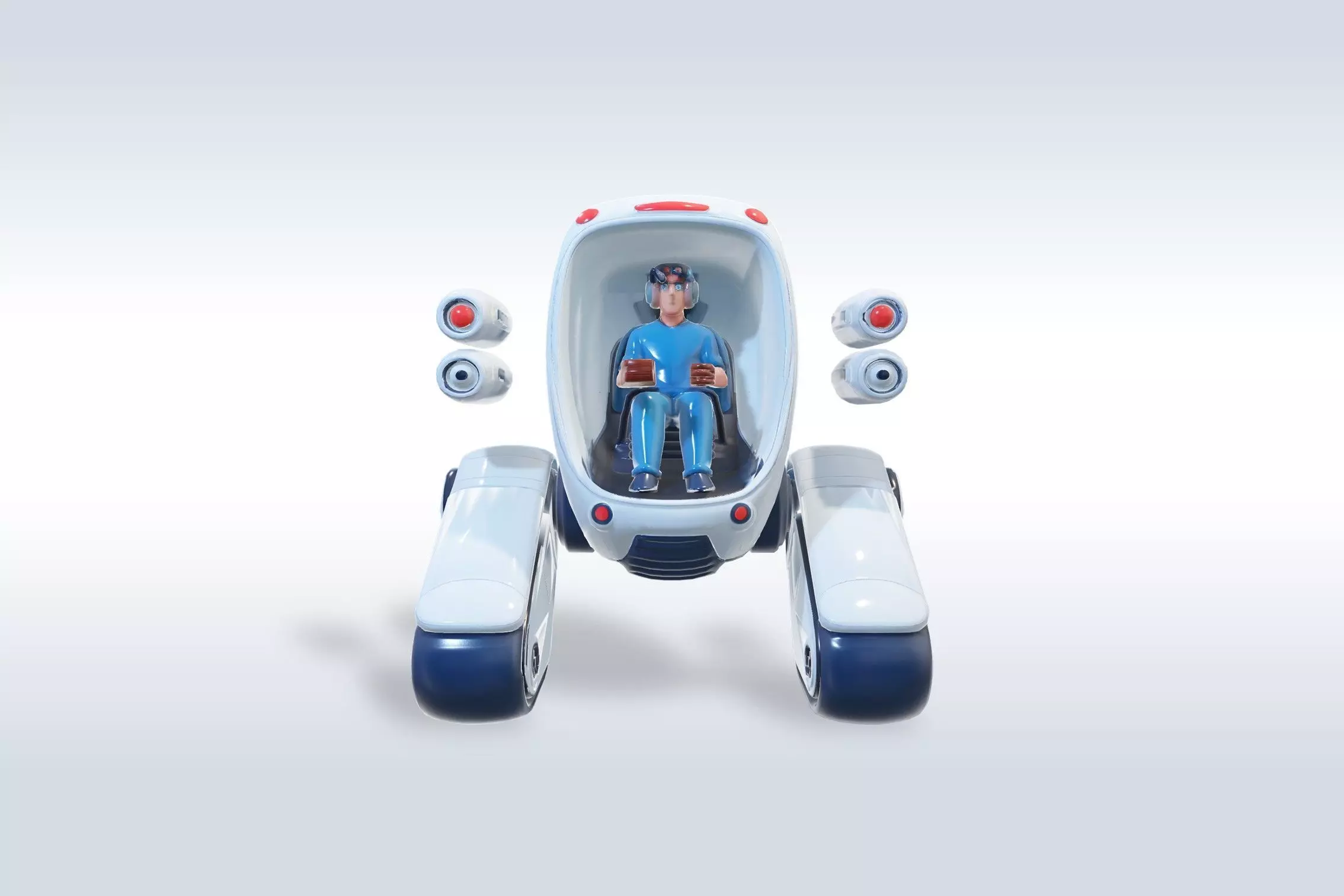 This is a high-quality futuristic sci-fi robot vehicle 3D model featuring a compact robotic pilot inside a transparent cockpit and advanced mechanical arms with energy modules. The design is ideal for games, cinematic renders, animations, AR/VR, concept visualization, and 3D printing.