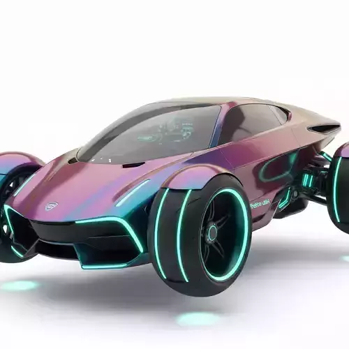 This cutting-edge 3D model depicts a futuristic three-wheeled concept vehicle designed with a sleek, low-profile silhouette and a striking cyberpunk aesthetic. The body features a pearlescent, iridescent paint job that shifts dynamically between hues of violet, gold, and cyan. Most notably, the vehicle is equipped with three oversized tires featuring luminous cyan LED rings, creating a hover-style visual effect against the ground. The minimalist exterior includes integrated neon light strips along the front fascia and a wide, panoramic glass canopy that reveals a high-tech digital interior dashboard. Ideal for science fiction gaming environments, advanced automotive visualizations, or conceptual transport designs, this asset represents a bold vision of next-generation electric mobility.