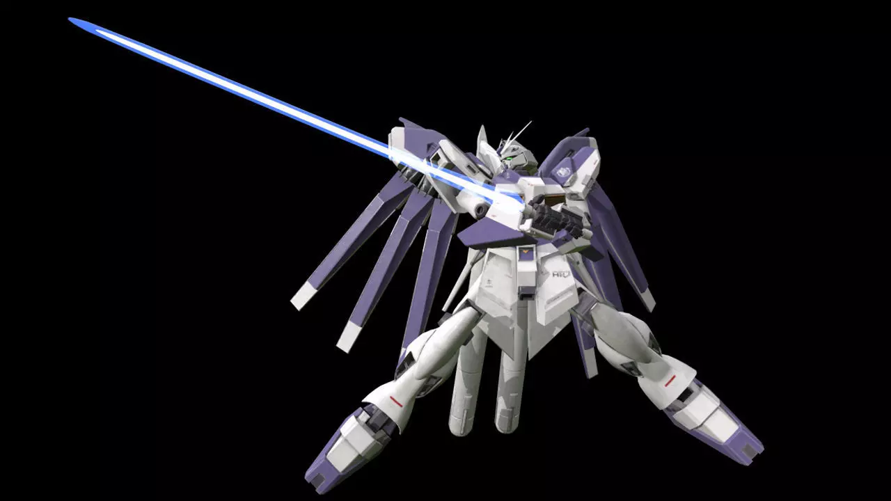 This game model is the Hi Nu Gundam Kai from the novelization Mobile Suit Gundam: Char's Counterattack -Beltorchika's Children . This mobile suit is piloted by Amuro Ray, the protagonist of the novel. It includes the gundam's beam rifle, beam saber, shield, and its fin funnel weapon system.