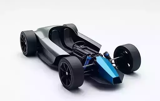 A sleek and detailed 3D model showcasing the exposed chassis of a futuristic, open-wheel sports car. The core bodywork is rendered in a smooth, matte metallic grey, while key mechanical components, particularly the suspension and engine elements, are highlighted with vibrant blue accents. The car features large, dark racing wheels with low-profile tires, a minimalist single or dual-seat cockpit, and visible suspension components, emphasizing its performance-oriented design. The model is presented against a clean white background, drawing focus to its intricate engineering and modern, high-tech aesthetic. This model is ideal for sci-fi racing games, concept vehicle visualizations, engineering simulations, or any project requiring a cutting-edge and stripped-down performance machine.