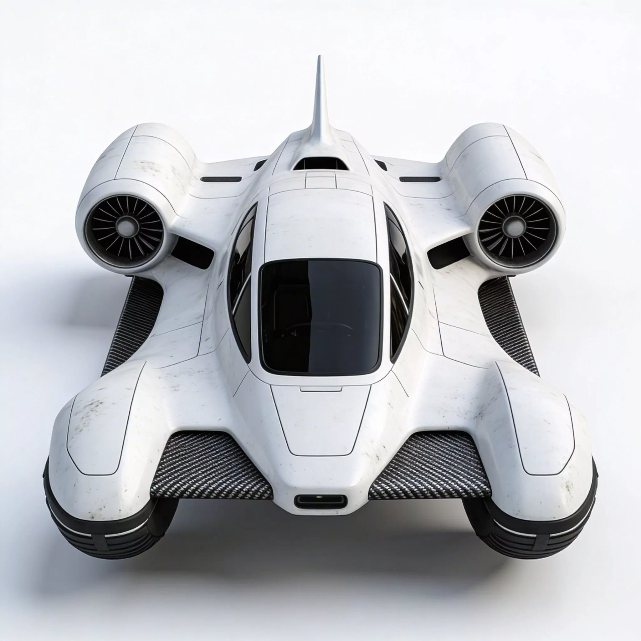 The lower body incorporates exposed carbon-fiber textured panels and front hover nodes, elegantly blending luxury automotive styling with advanced aerospace technology.