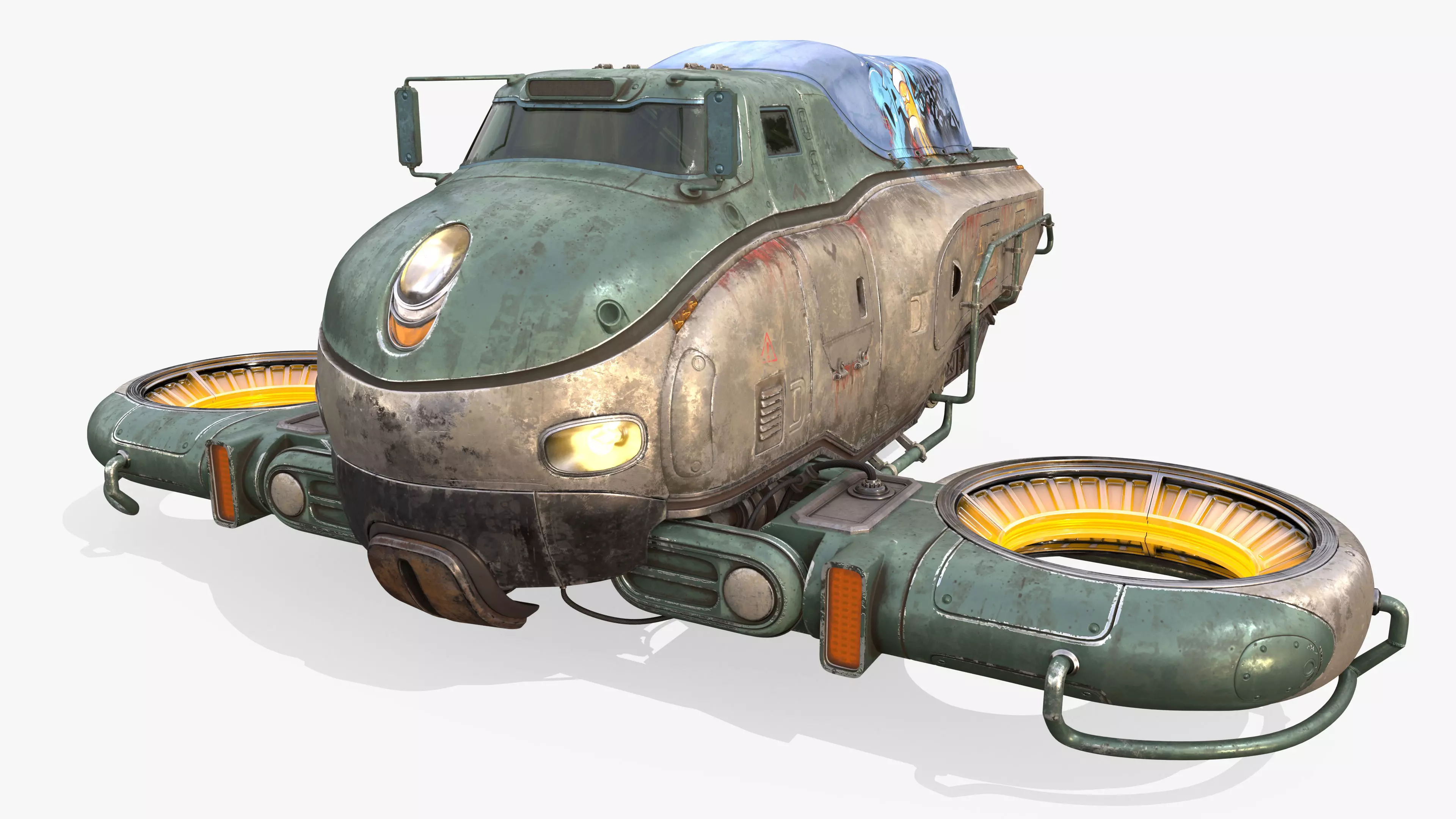 Immerse yourself in the world of science fiction with this highly detailed 3D model of the Sci-Fi Flying Hover Truck Space Fighter! This retro-futuristic truck, equipped with anti-gravity engines, is perfect for games, movies, animations, and virtual reality. The model is designed in a post-apocalyptic style with worn textures, graffiti, and aging elements, adding a unique and realistic touch.