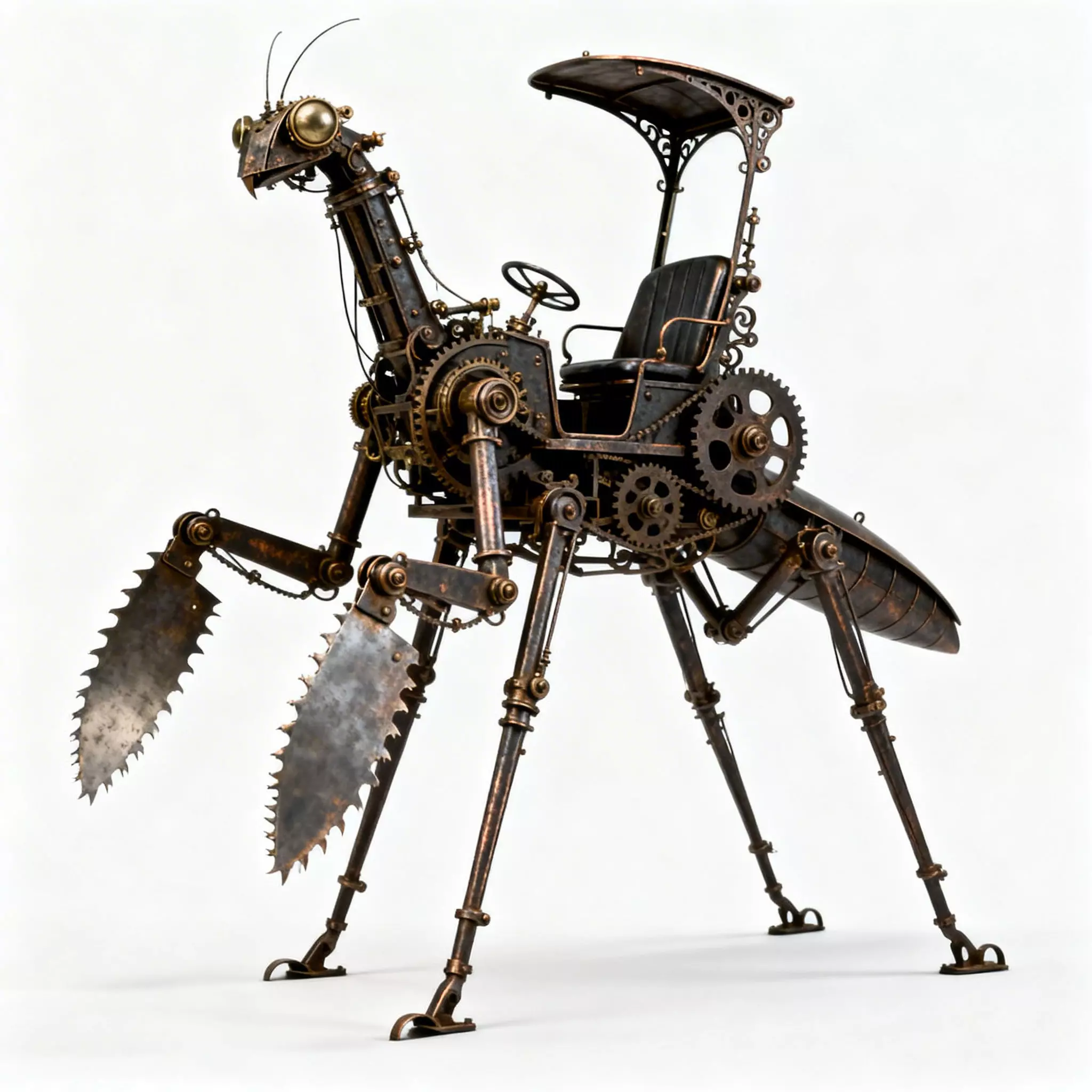 Elegant Filigree CanopyThe driver’s area is protected by a beautiful, arched metal canopy featuring intricate floral filigree patterns. This decorative touch, combined with the high-backed black leather seat, gives the vehicle a refined, high-society steampunk aesthetic.