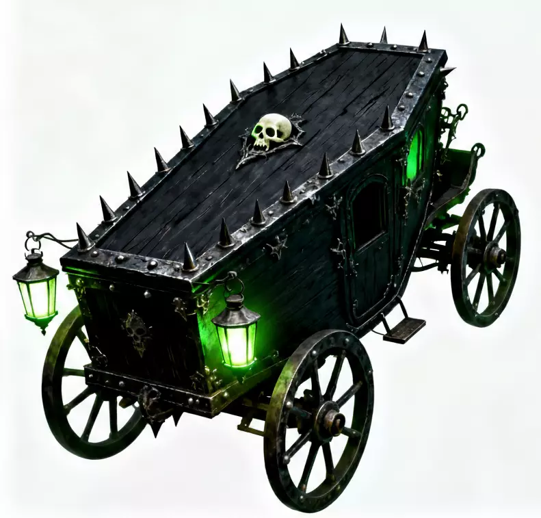 Coffin-Shaped ChassisThe main body of the carriage is built from thick, rotting black wood planks in the unmistakable shape of a burial casket. The lid is reinforced with iron rivets and features a row of sharp metal spikes along the edges to prevent anyone from escaping—or entering.