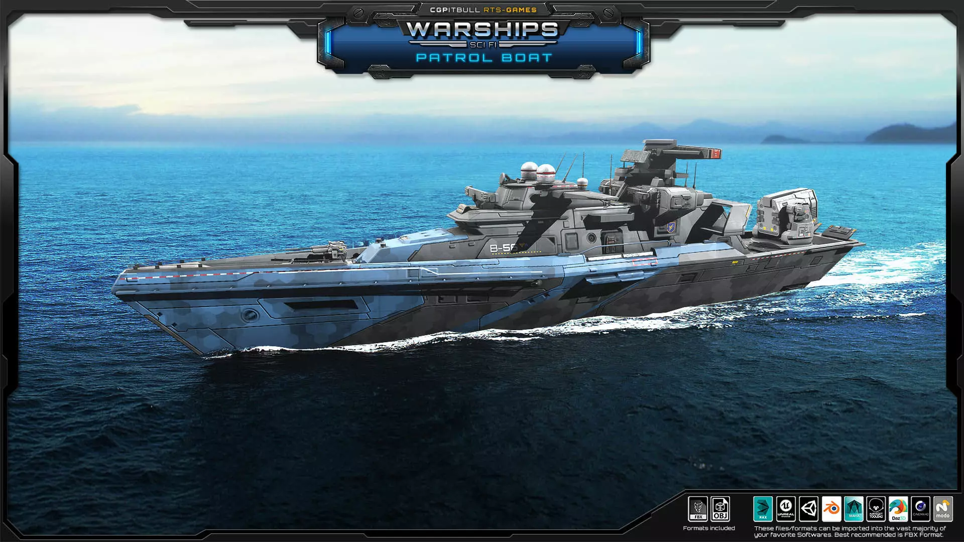 This Original package contains one Futuristic Patrol Boat. Discover more RTS GAMES Models, Ground, air vehicles and buildings In this CGPitbull account. (CGPitbull concept, does not repeat any existing work. You can use it without a doubt about copyright).