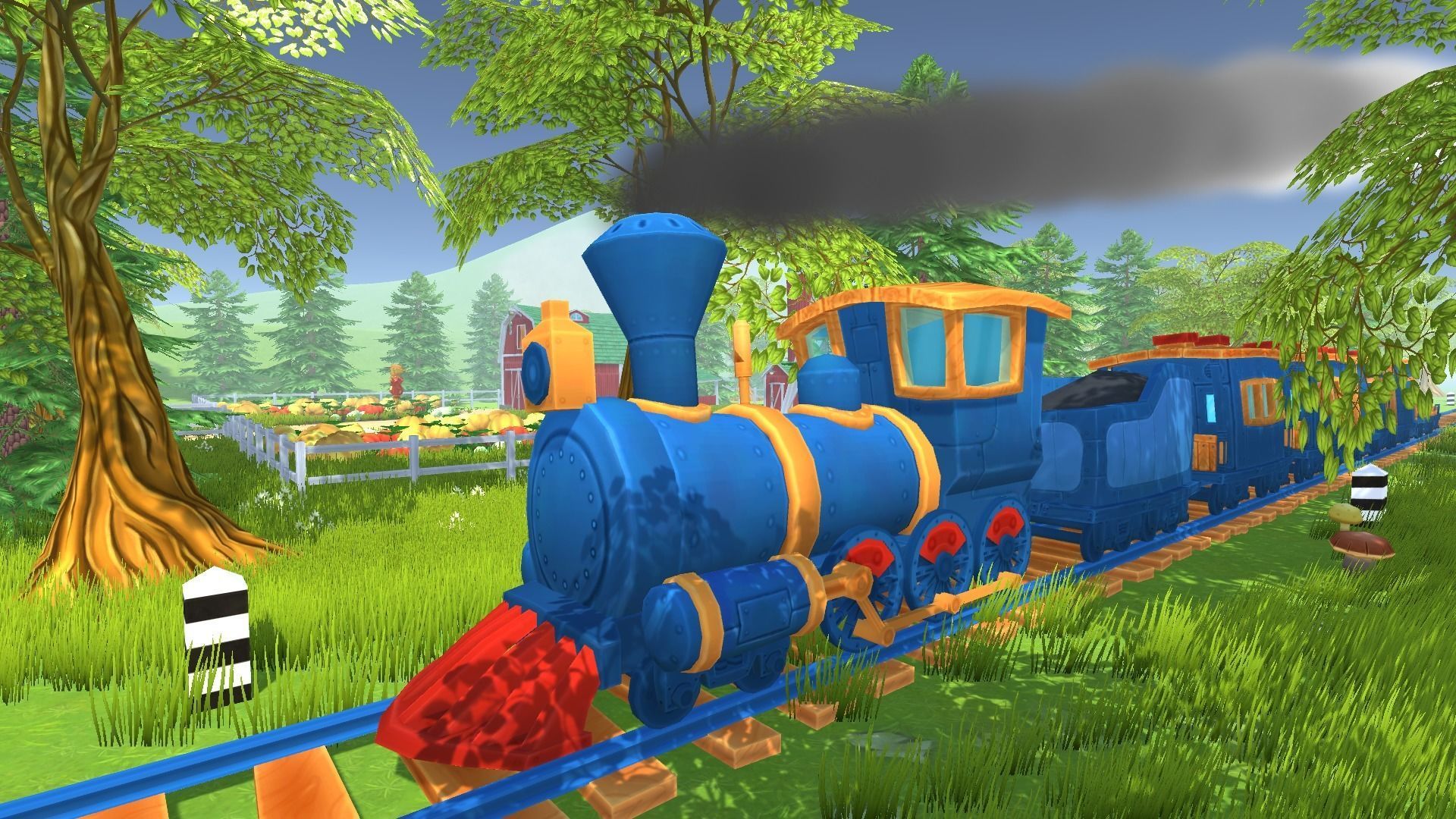 Cartoon locomotive with railway carriage, rails, road elements, houses, plants, ,farm and characters. Objects contain a box collider. Diffuse texture from 512 to 2048 pixels png - hand painted. Included 7 ground textures, 2 grass textures and Particle System for steam locomotive exhaust smoke.