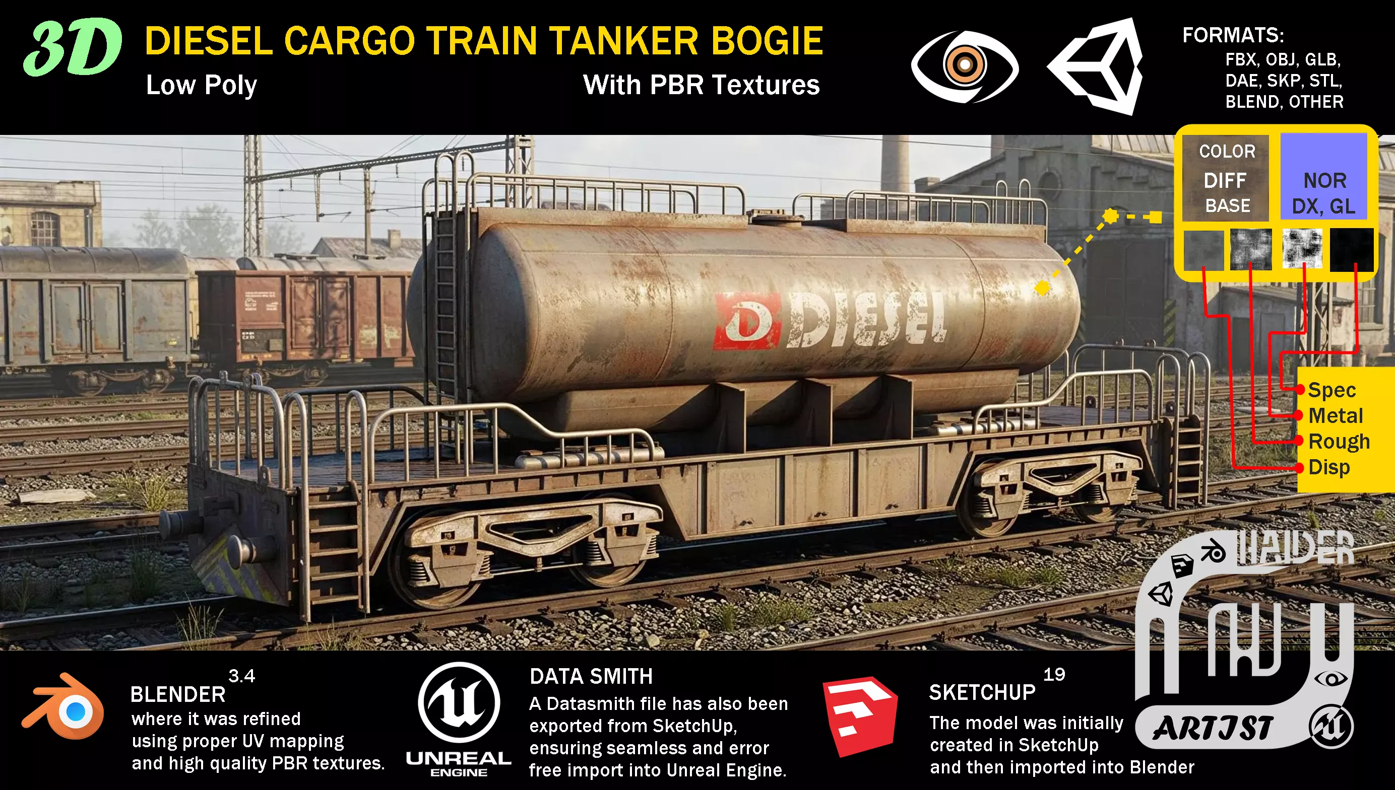 This 3D model represents a realistic diesel cargo train tanker bogie designed at millimeter scale to ensure accurate proportions and easy adjustment in any game engine or visualization project. This bogie is typically attached behind the engine and is used to carry diesel fuel, while passenger coaches are designed separately.