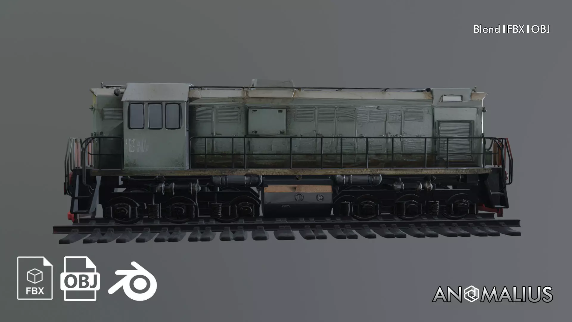 A heavy industrial locomotive with a weathered exterior, featuring detailed mechanical components, railings, and undercarriage systems. The design emphasizes a worn, utilitarian look with visible panels, vents, and structural elements. Suitable for rail yards, industrial zones, or dystopian and post-industrial environments.