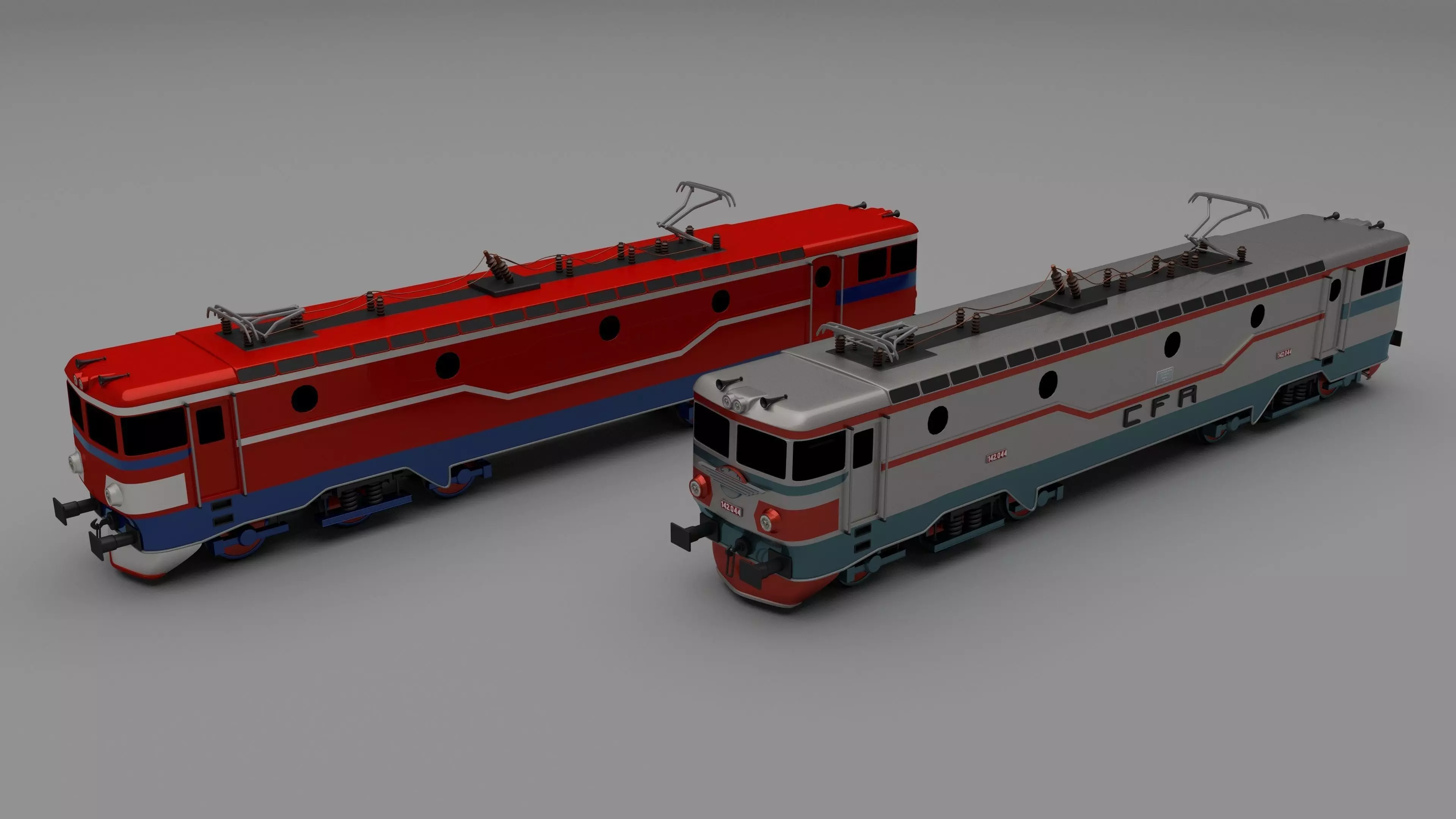 Two very accurate models of two electric locomotives(Romanian CFR Class 42 and a generic one). The models come in four formats: -.blend, rendered with cycles, as seen in the images; -.obj, with materials and textures applied; -.dae, with materials and textures applied; -.stl,3D PRINT READY;