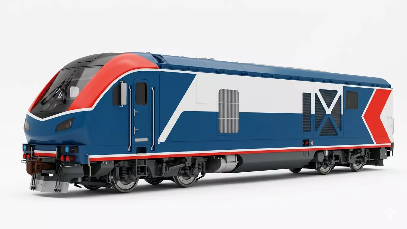 This is a highly detailed 3D model of a modern diesel-electric locomotive, featuring a sleek aerodynamic front cowl and a professional tri-color livery in blue, white, and red. Designed for versatility in architectural visualization, railway simulations, and digital environments, the model showcases realistic mechanical detailing on the bogies, undercarriage, and ventilation systems.
